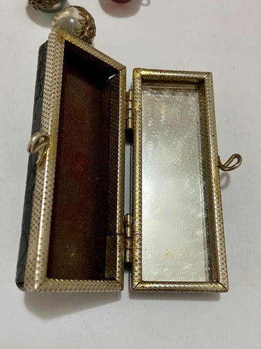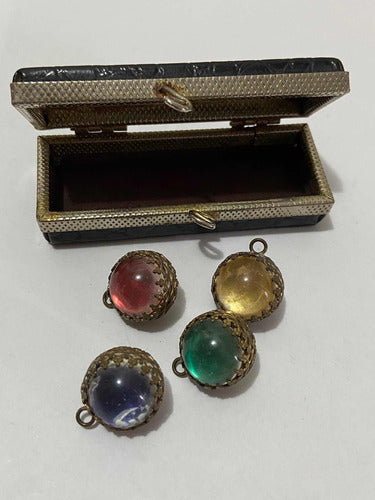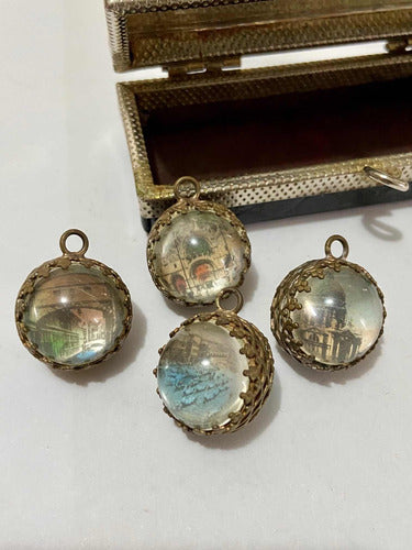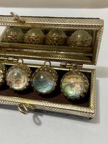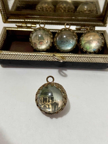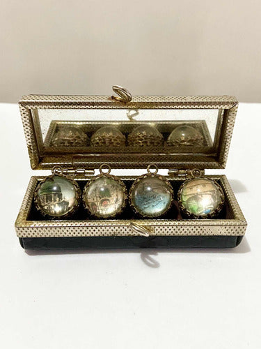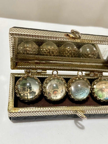Tamanho caixa : 9x3,5cm - pingentes 2cm. Raríssima caixa antiga com 8 pingentes esféricos em vidro. Os pingentes possuem aro de metal com acabamento detalhado. As imagens internas são minuciosamente aplicadas sob vidro em efeito lupa, retratando pontos turísticos clássicos, como catedrais e monumentos históricos.