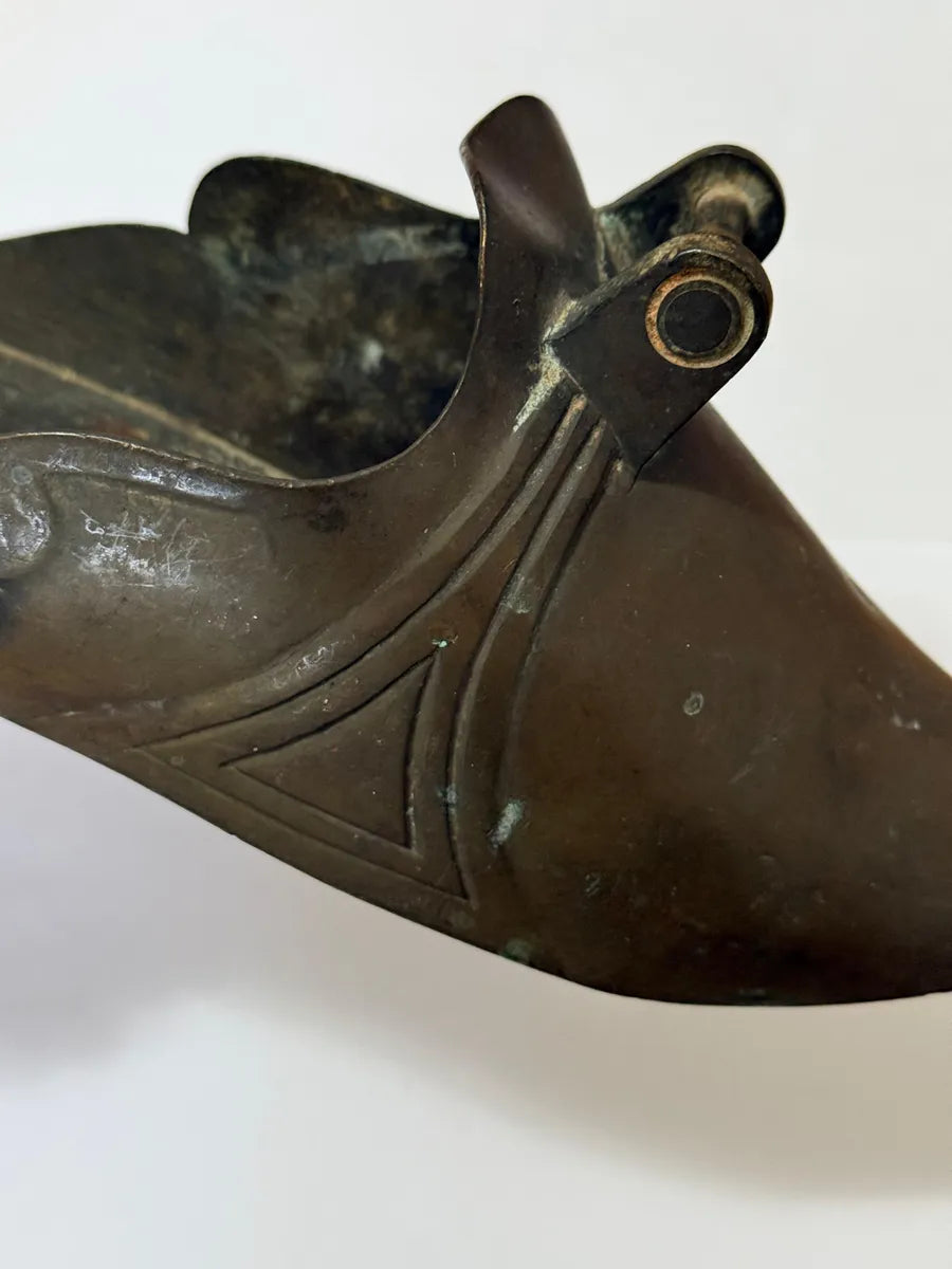 Antiga floreira em metal, em formato artístico de sapata, com belíssima pátina original do tempo. Peça de caráter ornamental, ideal para uso como floreira de parede, suporte ou item decorativo. Possui furo traseiro para fixação. Apresenta marcas naturais de uso compatíveis com a idade.