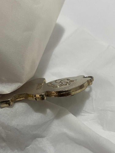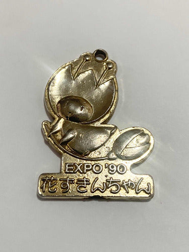 Chaveiro colecionável da Expo'90 (Exposição Internacional de Horticultura), realizada em Osaka, Japão. A peça representa a mascote oficial do evento, Hanazukin-chan, uma simpática personagem com tema floral. Feito em metal dourado, com inscrição em japonês e espaço superior para uso como pingente ou chaveiro.