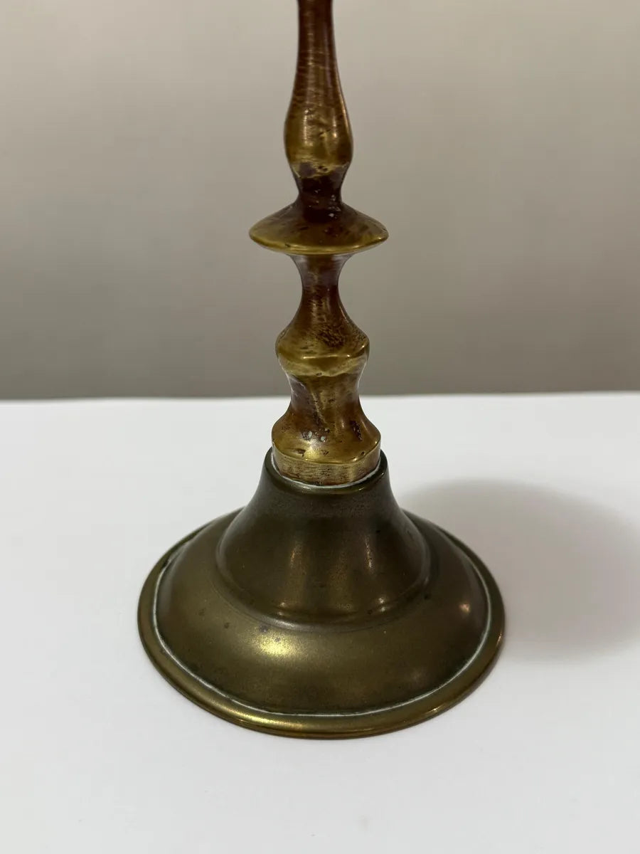 Castiçal antigo em bronze/latão, medindo 15,5 cm de altura. Design clássico inglês, final do século XIX ao início do século XX, com pátina original.