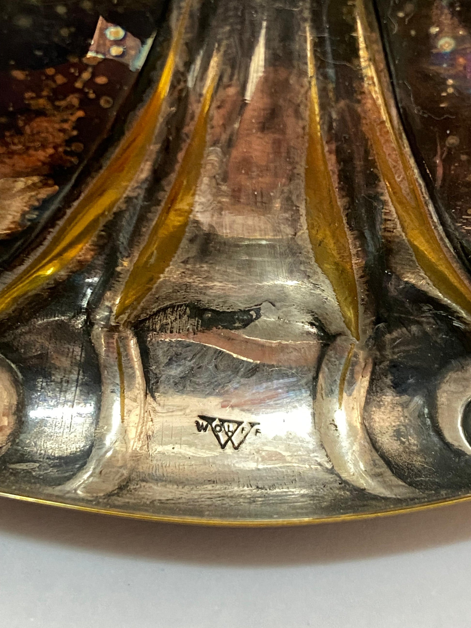 Elegante centro de mesa antigo da marca Wolff, tradicional fabricante de artigos em prata e metal prateado. A peça possui formato arredondado, com bordas trabalhadas e design clássico, ideal para uso como fruteira, centro de mesa ou objeto decorativo.