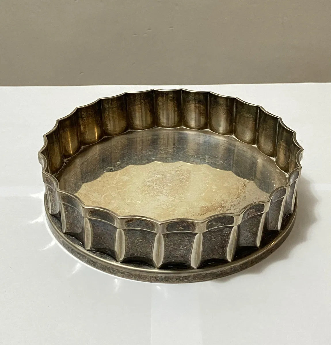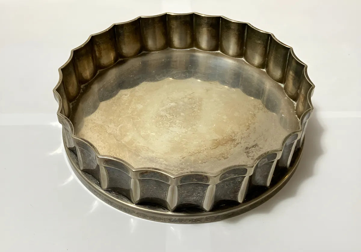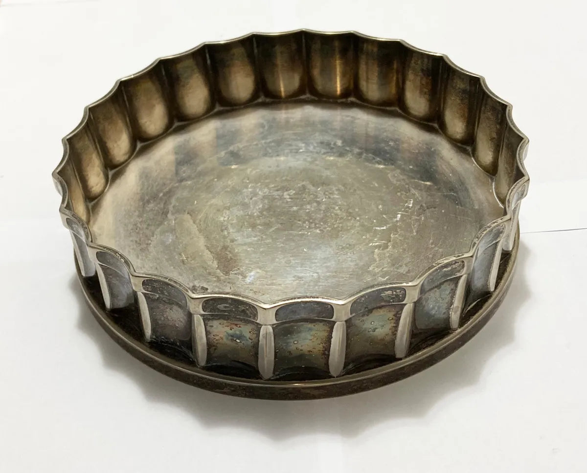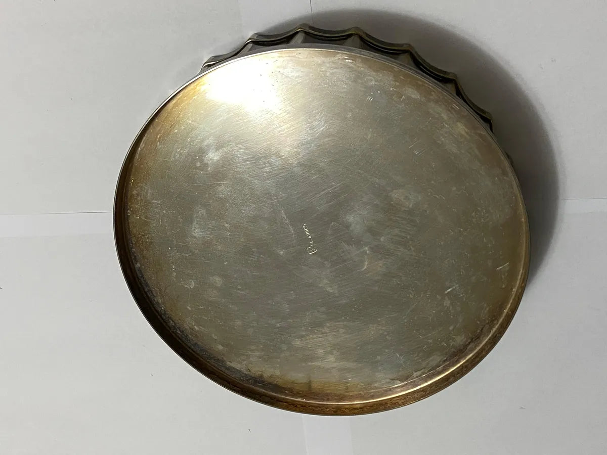 Descanso de garrafa da marca St. James, em metal prateado, com bordas onduladas em relevo e acabamento clássico. Ideal para apoiar garrafas de vinho ou licor, protegendo a mesa de marcas e respingos. Peça antiga, com pátina natural.