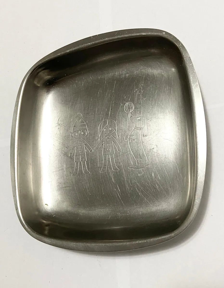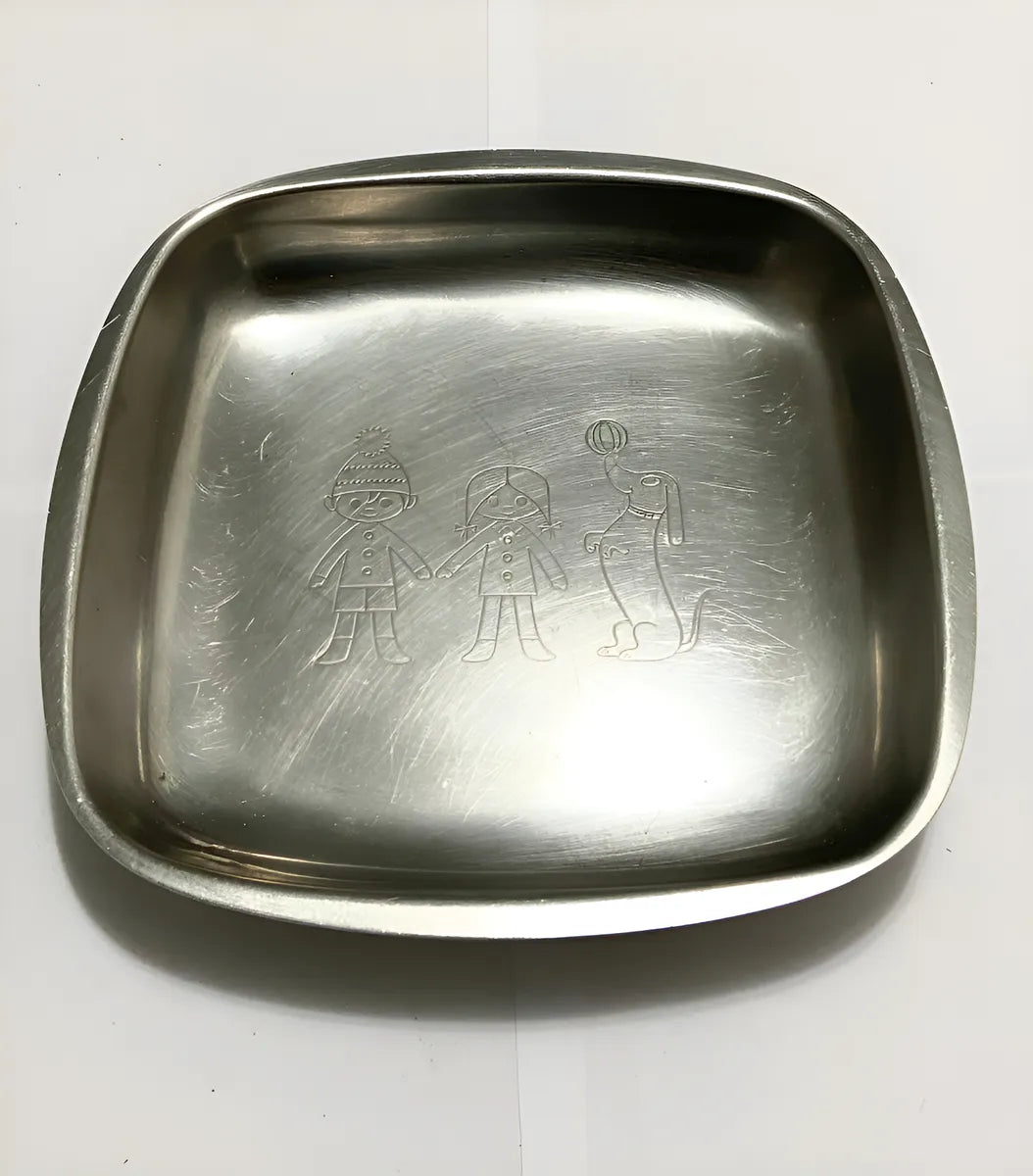 Prato infantil antigo em inox da marca Hercules Inox (18-8), fabricado no Brasil. Modelo quadrado com delicada gravura de duas crianças e um cachorro brincando com bola, em estilo lúdico e retrô.