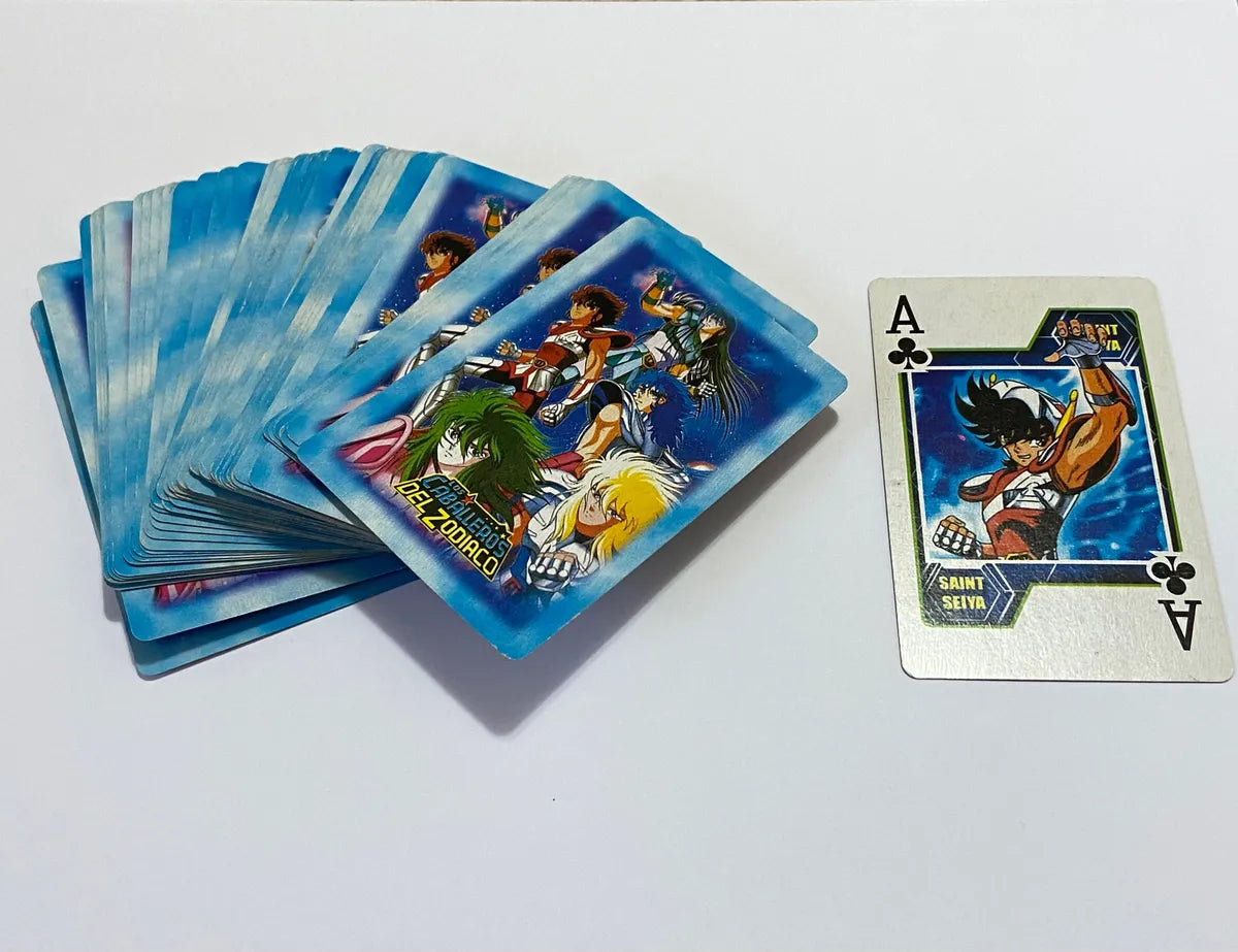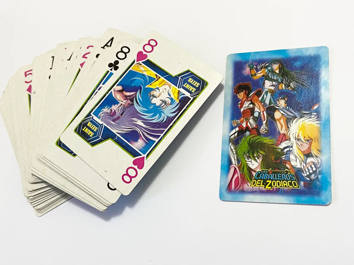 Raro baralho temático da famosa série Los Caballeros del Zodiaco (Cavaleiros do Zodíaco), com ilustrações coloridas dos personagens clássicos do anime em cada carta.