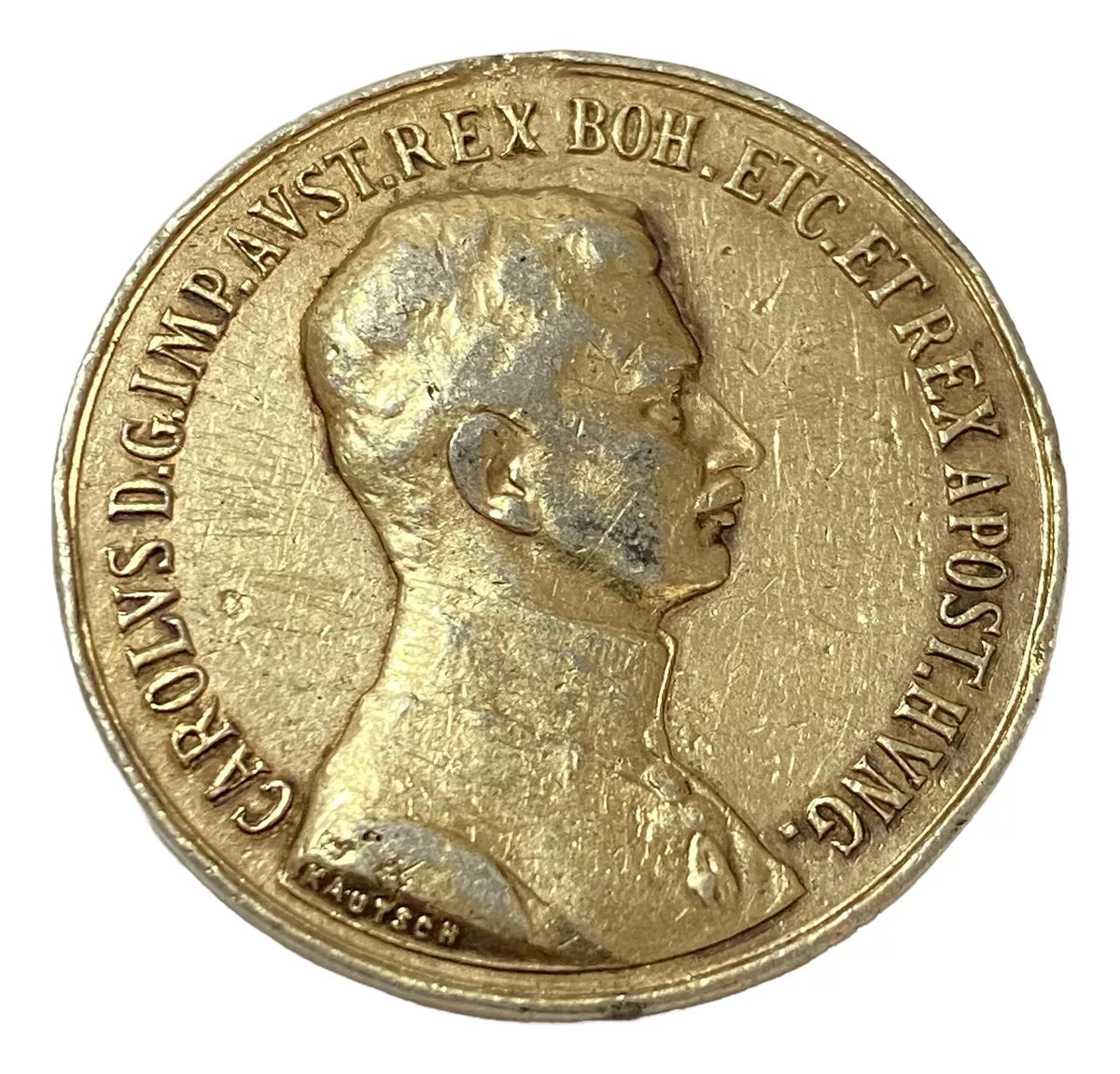 A medalha com a inscrição "CAROLVS D.G. IMP. AVST. REX BOH. ETC. ET REX APOST. HVNG." faz referência ao imperador Carlos I da Áustria (Karl I, em alemão), que foi o último imperador do Império Austro-Húngaro.