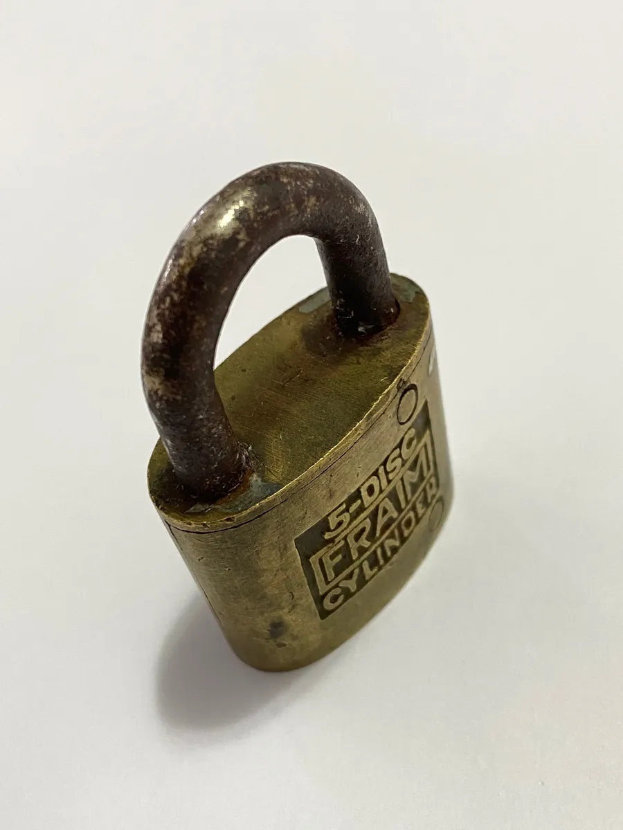 Cadeado antigo da marca Fraim, apresentando a gravação "5-DISC FRAIM CYLINDER" na parte frontal e "MADE IN U.S.A."