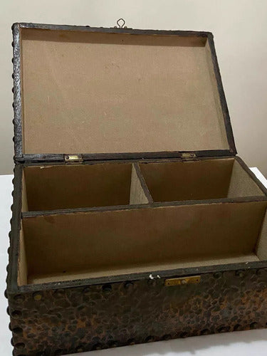 Caixa vintage em cobre repuxado com relevante textura martelada e belíssimo alto-relevo de dois peixes na tampa. Há uma marcação visível, mas que não foi possível confirmar como assinatura de artista conhecido, podendo se tratar de selo, estúdio ou outra identificação. A pátina e execução artesanal conferem autenticidade e apelo decorativo significativo.