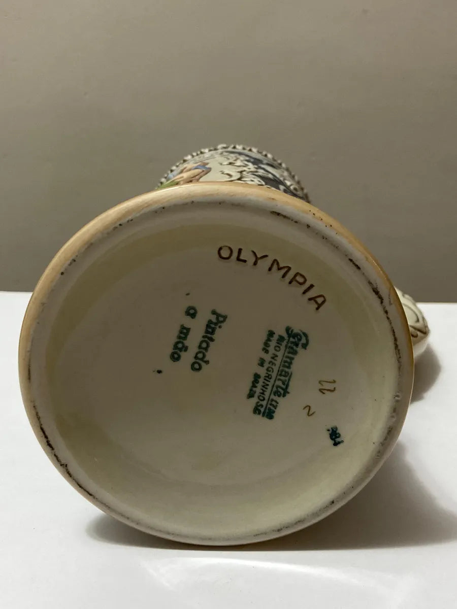 Par de canecas de cerveja estilo alemão, pintadas à mão com tampa em metal trabalhado. Cada peça traz cenas tradicionais de confraternização e possui riqueza de detalhes em relevo. No verso, inscrição original: “Ceramarte Ltda – Rio Negrinho SC – Pintado à mão – Olympia”