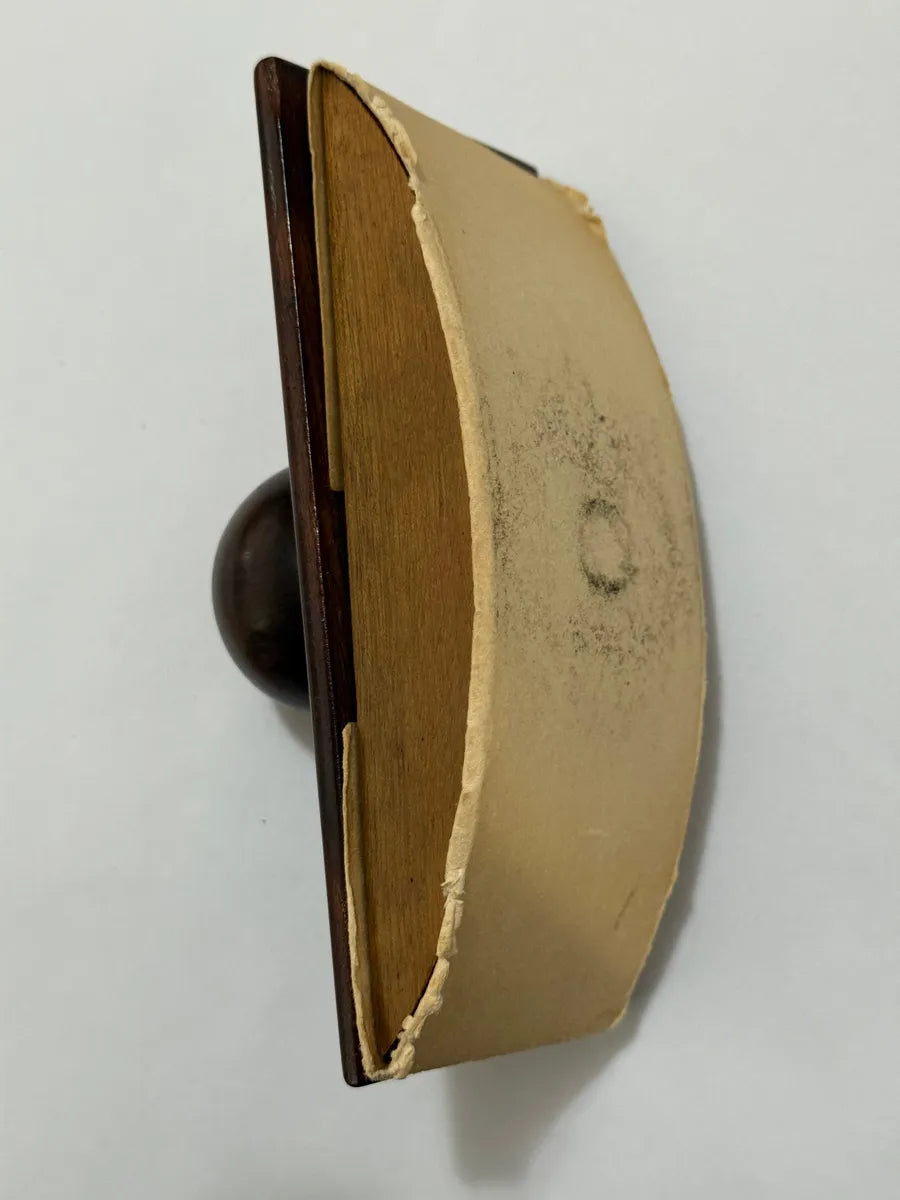 Peça antiga utilizada como secador de tinta / blotter, muito comum em escritórios e mesas de escrita no início do século XX. Produzida em madeira nobre com acabamento em marchetaria geométrica, possui cabo esférico também trabalhado em madeira.