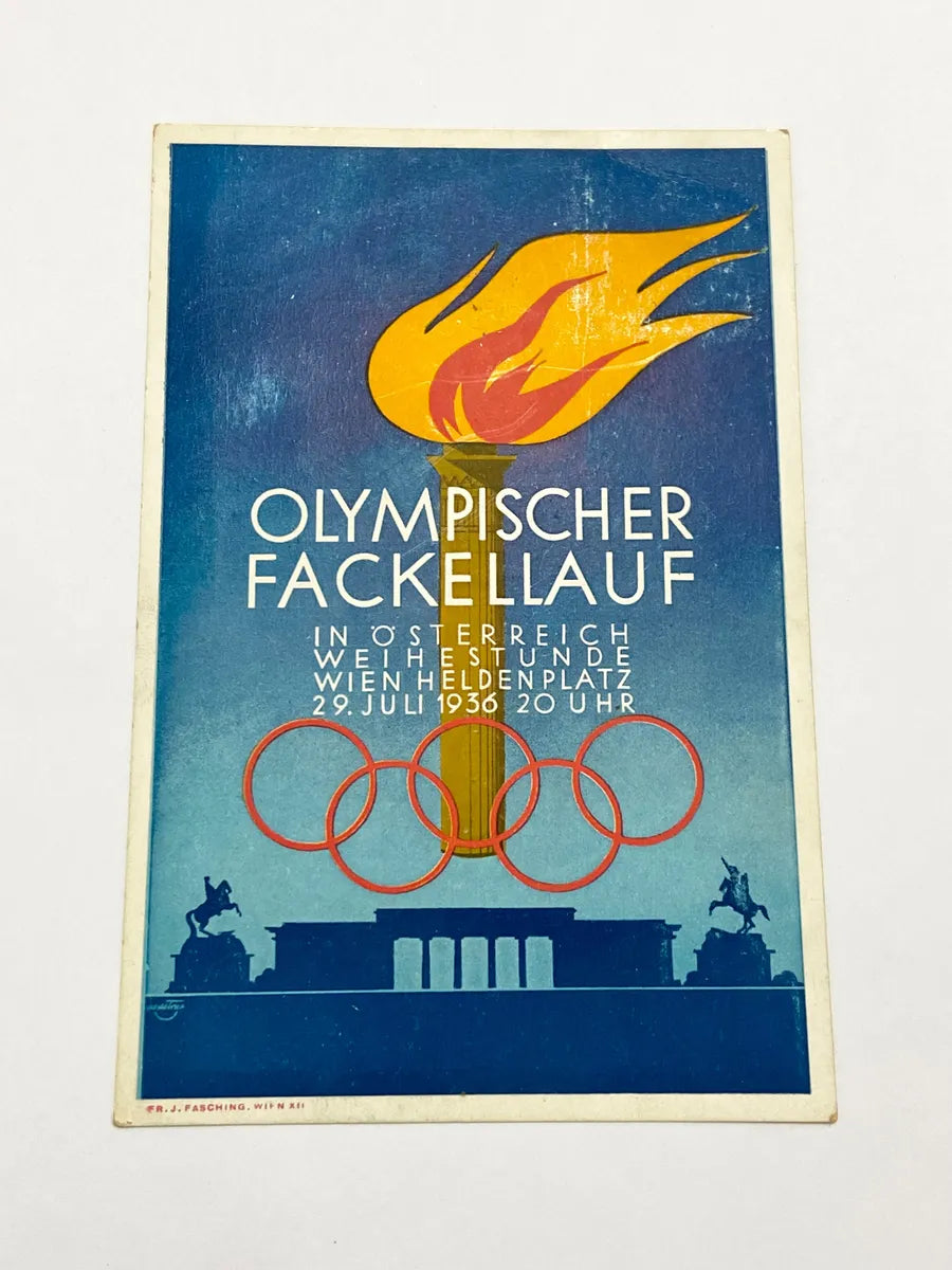 Cartão postal comemorativo das Olimpíadas de 1936, celebrando o revezamento da tocha olímpica em Viena, Áustria, no dia 29 de julho de 1936.
