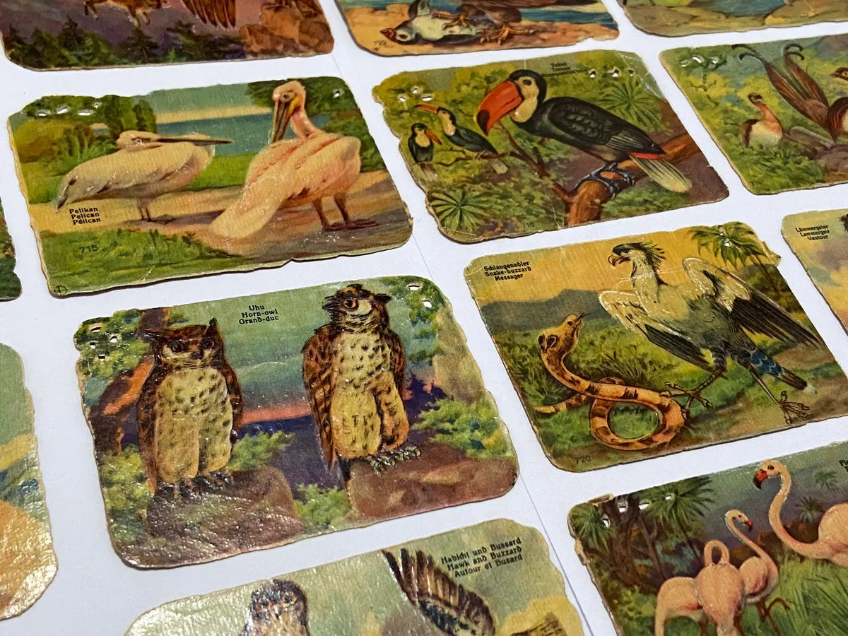 Lote de cartas colecionáveis antigas, ilustradas com imagens coloridas de aves. No verso, trazem o texto publicitário da Stadtsparkasse Deggendorf (Alemanha), acompanhadas de frases educativas. Impressão de época pela editora B. Wellßmann, München 19.