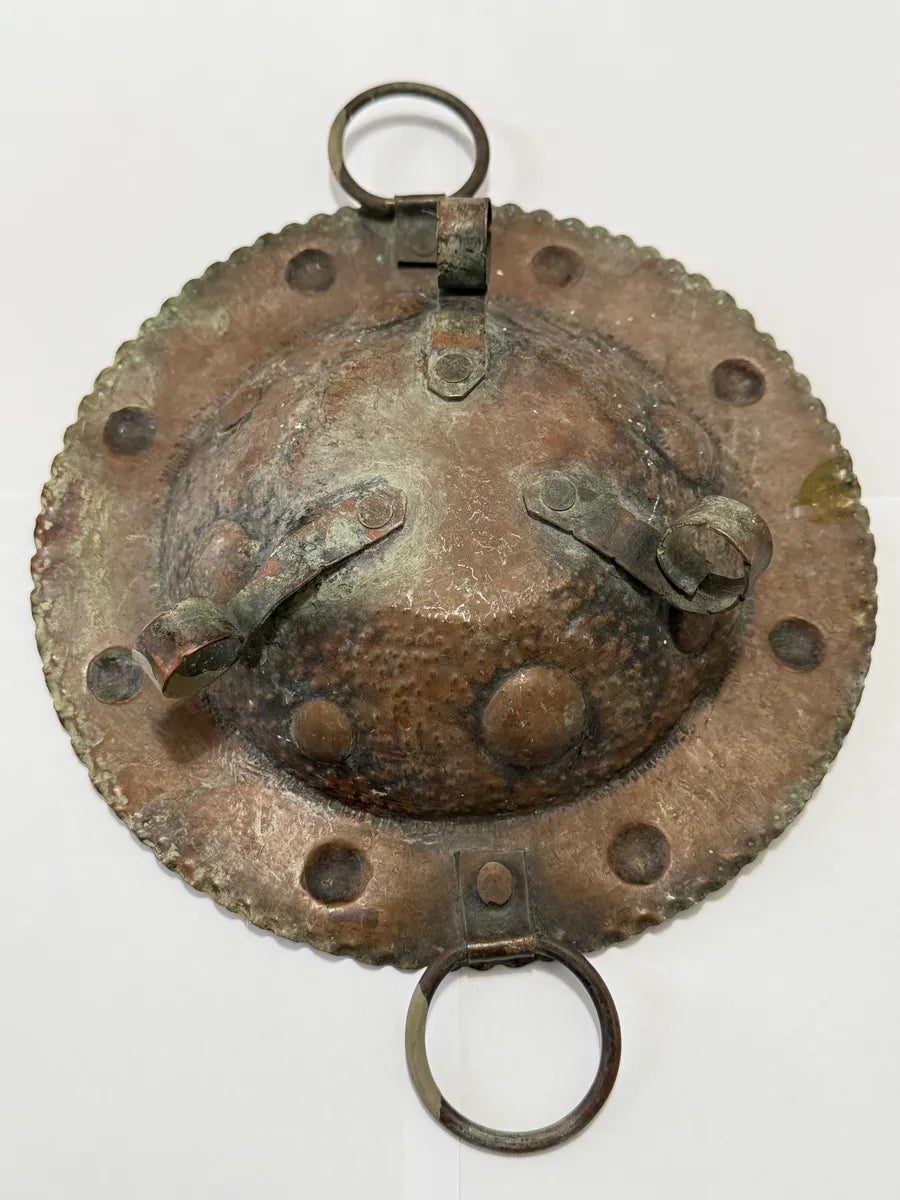 Peça antiga em cobre martelado, com alças laterais e detalhes em relevo. Apresenta pátina natural do tempo, conferindo charme e autenticidade à peça. Mede 23cm de diâmetro.