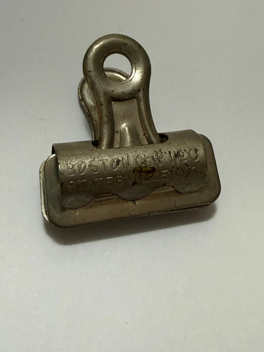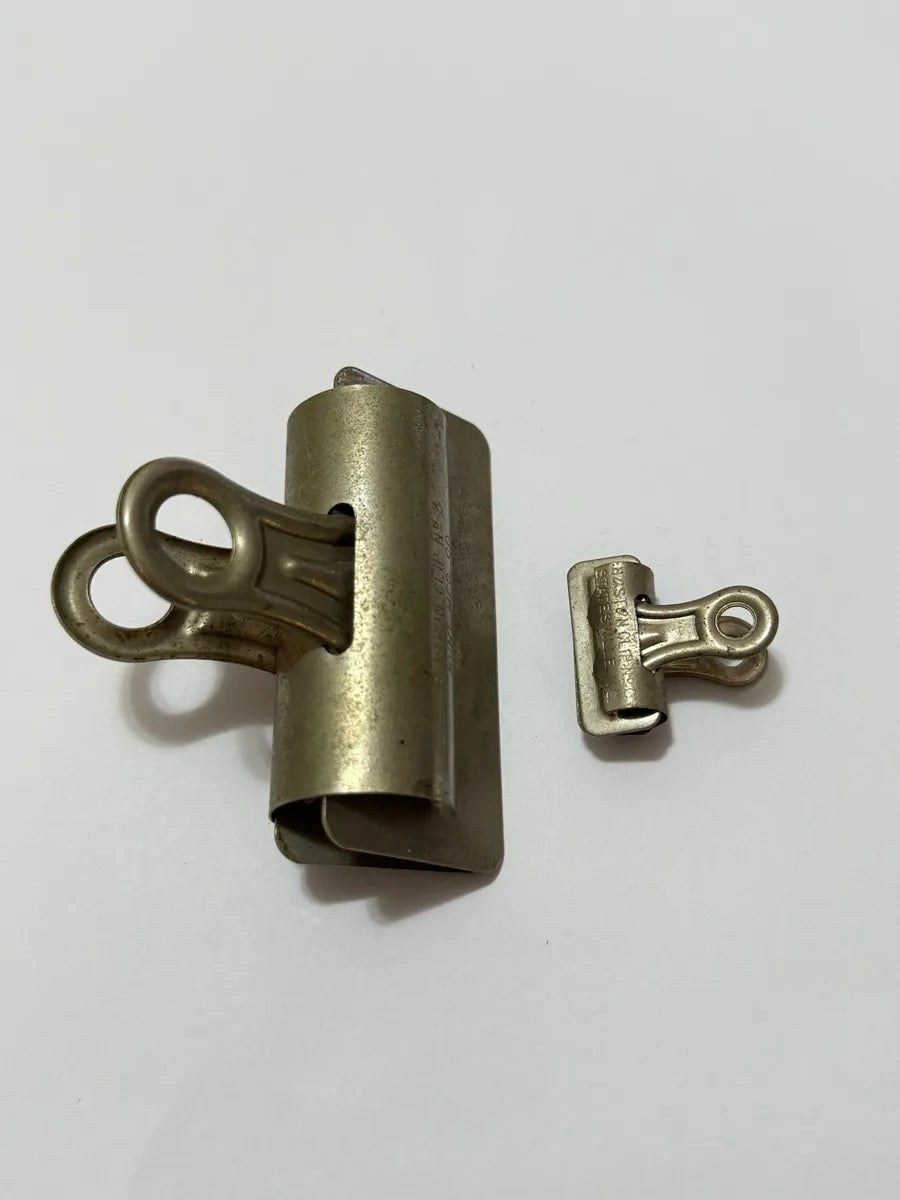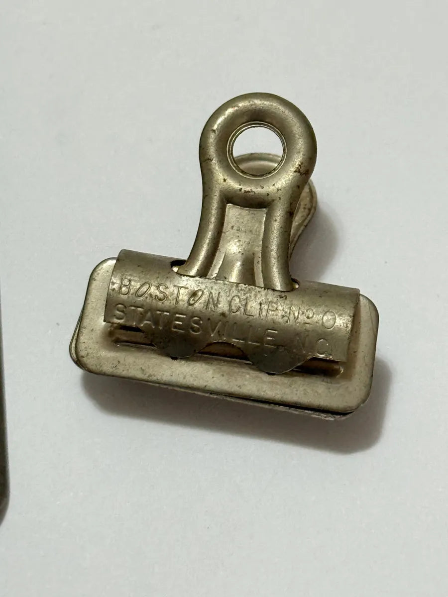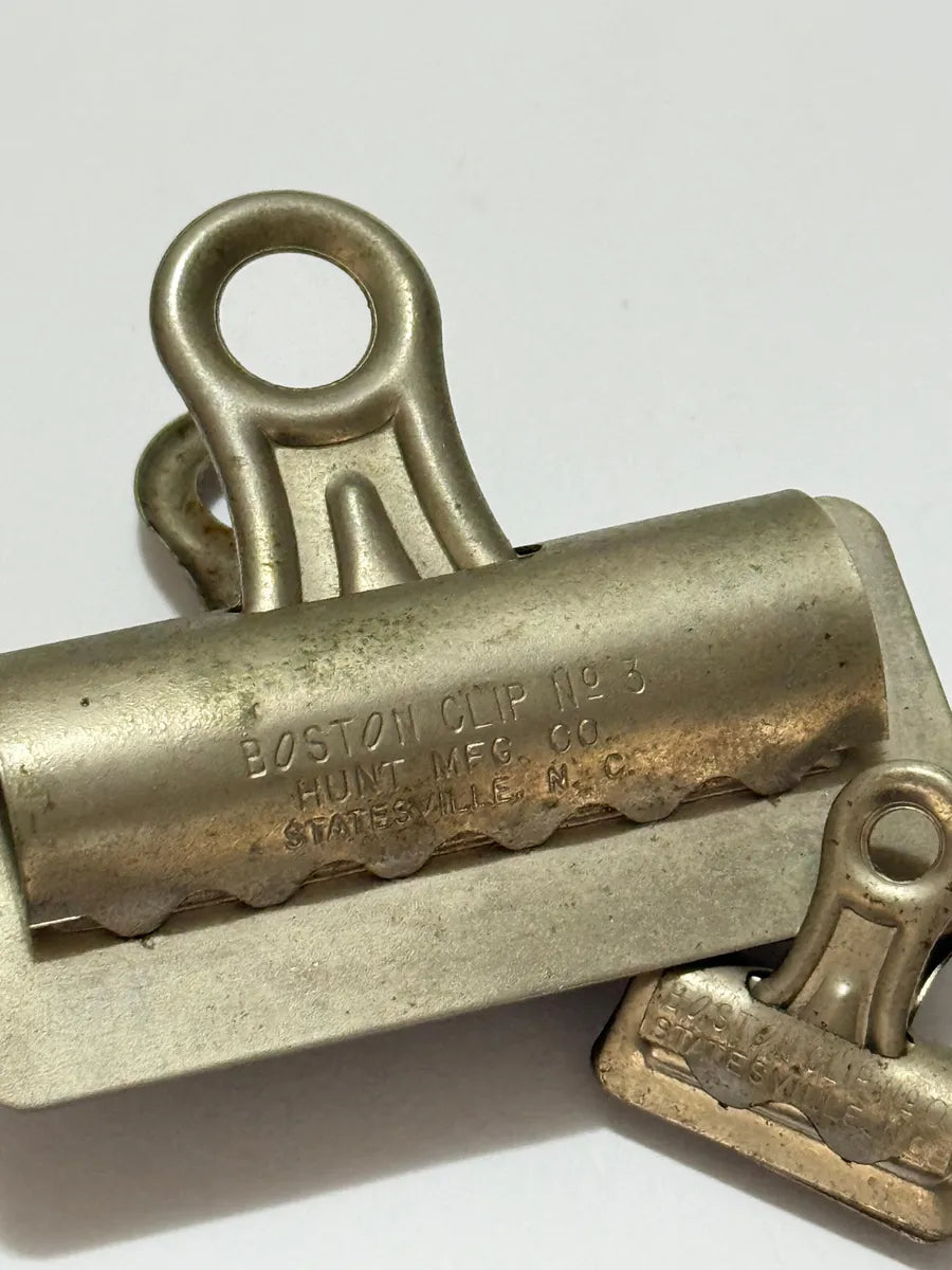 Par de clipes metálicos antigos da marca Boston Clip, modelos Nº3 e Nº0, fabricados pela Hunt Manufacturing Co., Statesville, N.C. (EUA). Peças originais de época.