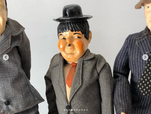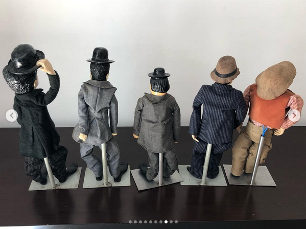 Coleção antiga composta por 5 bonecos representando comediantes clássicos do cinema mudo e da era de ouro da comédia. As figuras são feitas com riqueza de detalhes, vestimentas em tecido costurado à mão e expressões caricatas que remetem aos personagens icônicos de Charles Chaplin, Laurel e Hardy (O Gordo e o Magro), além de outros tipos populares da comédia da primeira metade do século XX.