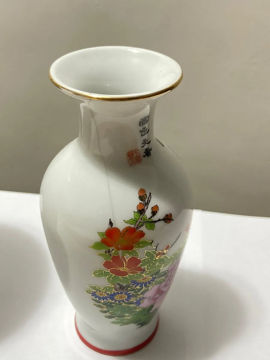 Belo conjunto de 3 vasos orientais em porcelana, ricamente decorados com flores em tons de vermelho, rosa, verde e detalhes dourados. As peças apresentam acabamento de alta qualidade, com bordas finamente trabalhadas e pintura delicada.