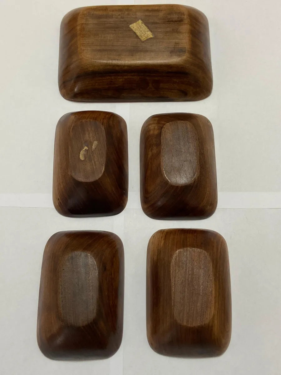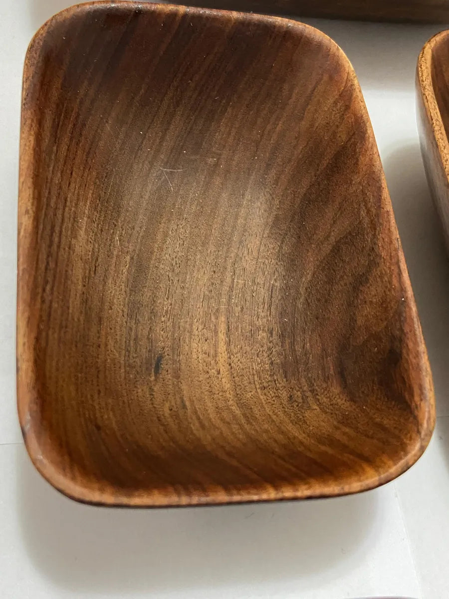 Conjunto de tigelas retangulares em madeira nobre, com belo acabamento artesanal e veios naturais aparentes. Trata-se de peças vintage brasileiras, provavelmente em jacarandá, madeira de grande valor estético e muito utilizada na produção artesanal entre as décadas de 1960 e 1980.