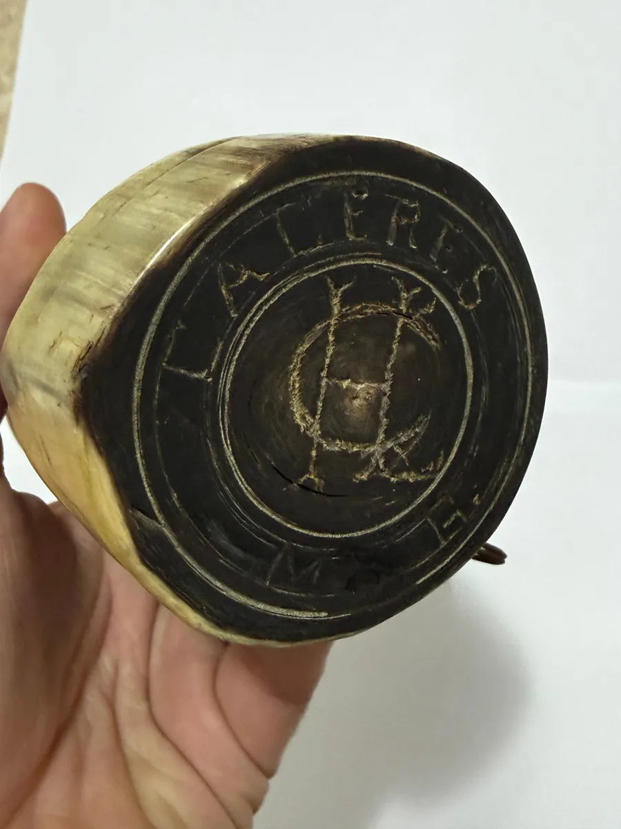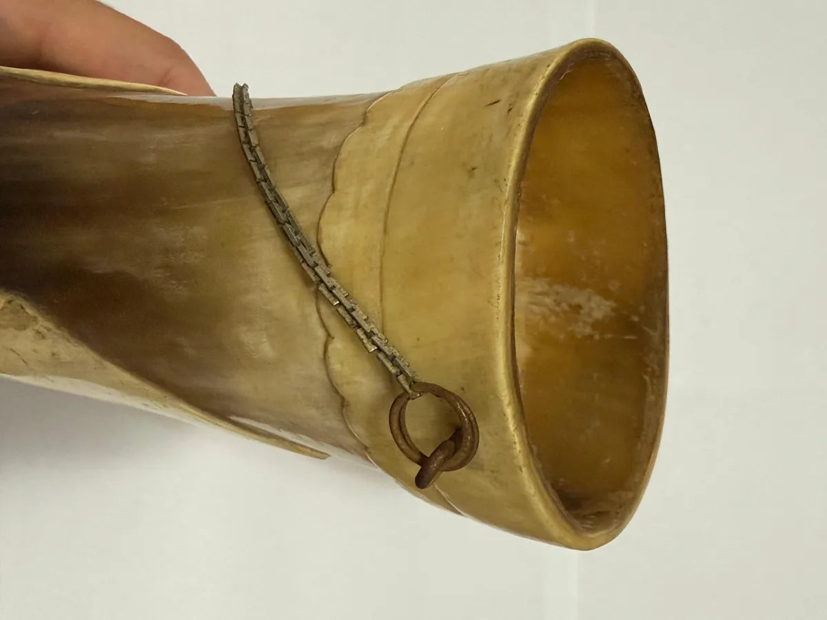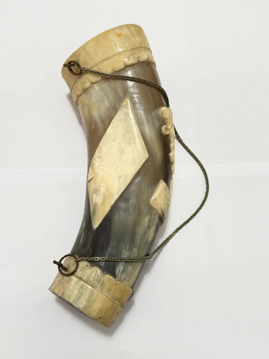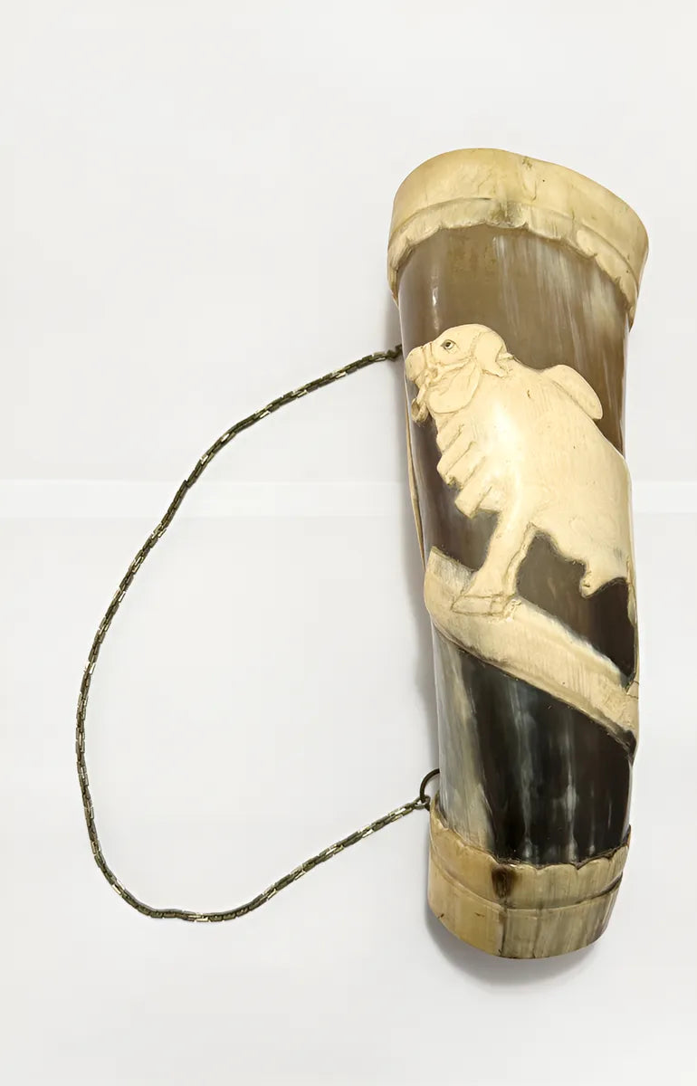 Rara guampa/copo antigo confeccionado em chifre natural, lindamente entalhado à mão com a figura de um boi em relevo.