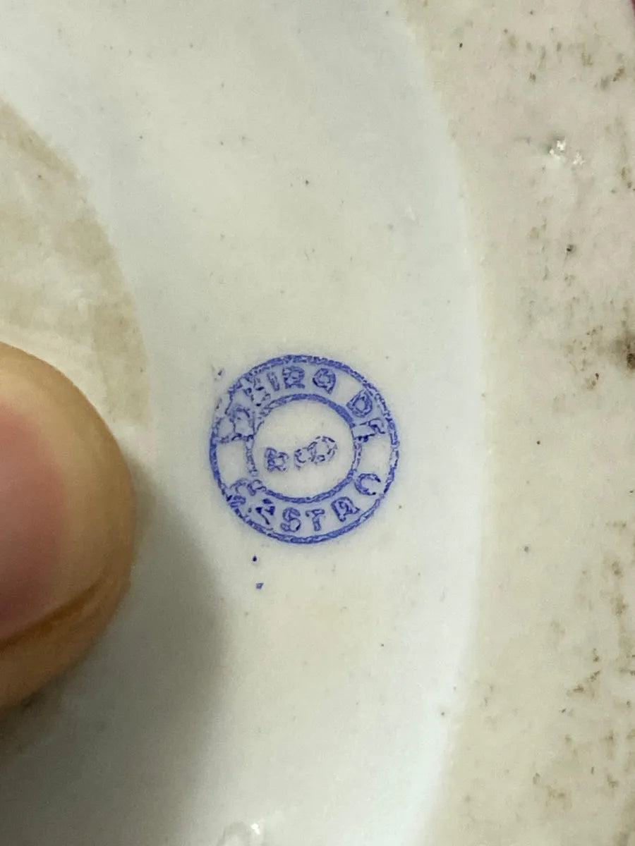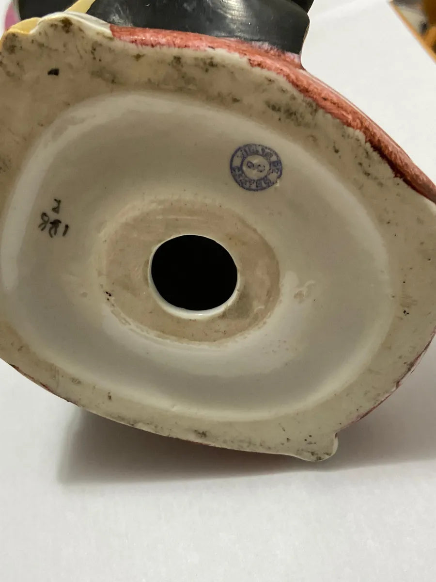 Par de estatuetas antigas em porcelana assinadas na base com a marca "Vieira de Castro". Representam um casal em trajes orientais tradicionais, ricamente pintados à mão em cores vivas com detalhes em dourado.