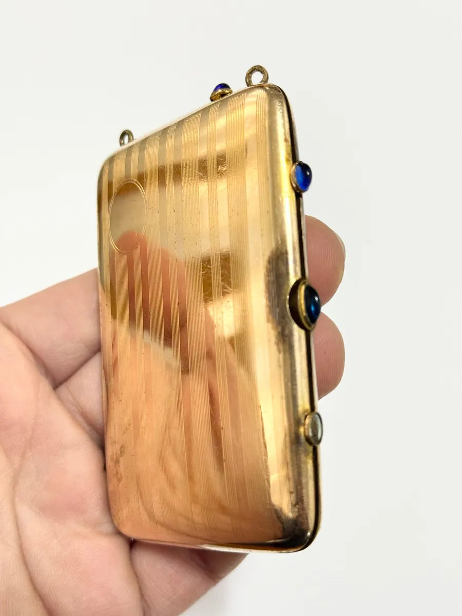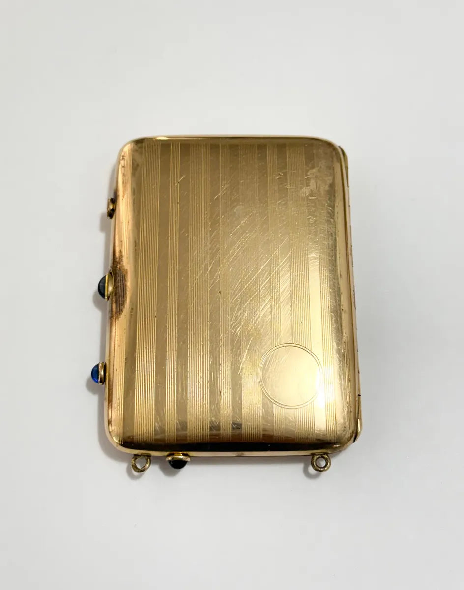 Estojo / Porta Cartão antigo da marca W&H Co (Wright & Hodges Company), fabricado no início do século XX. Peça em metal banhado a ouro, com acabamento interno escovado e lindos detalhes em cabochões azuis nas extremidades. Possui compartimentos internos e estrutura articulada de alta qualidade.