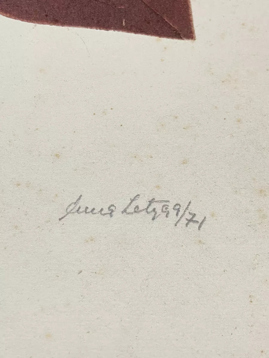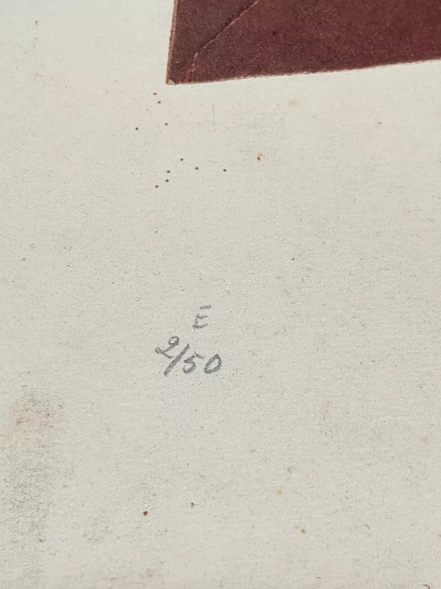 Gravura antiga e assinada, parte de uma edição limitada (9/71). A composição apresenta uma espiral dentro de um quadrado na parte superior e um padrão geométrico simétrico na parte inferior, remetendo a elementos arquitetônicos e formas orgânicas.