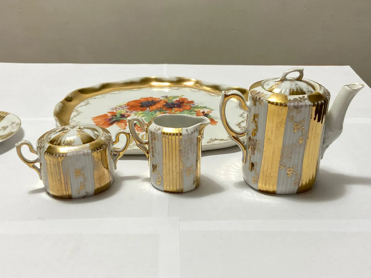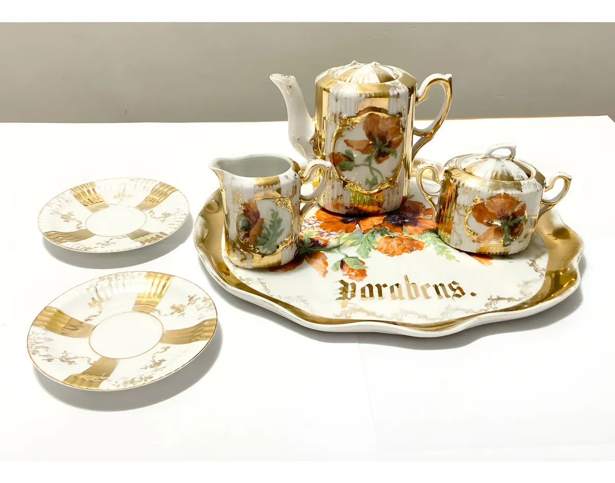 Belo conjunto antigo de chá em porcelana decorada com flores e ricos detalhes em dourado. A bandeja traz a inscrição "Parabéns", tornando a peça ainda mais especial para presentes comemorativos ou decoração.