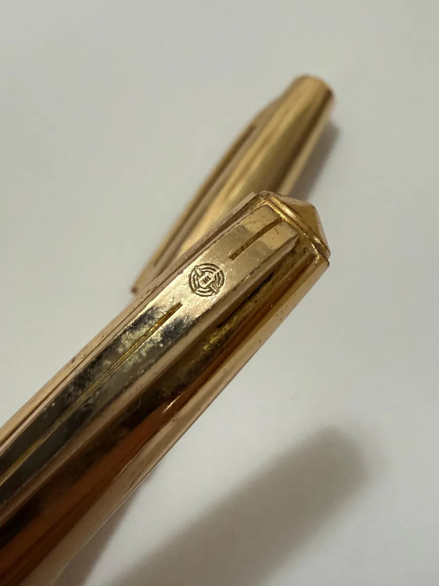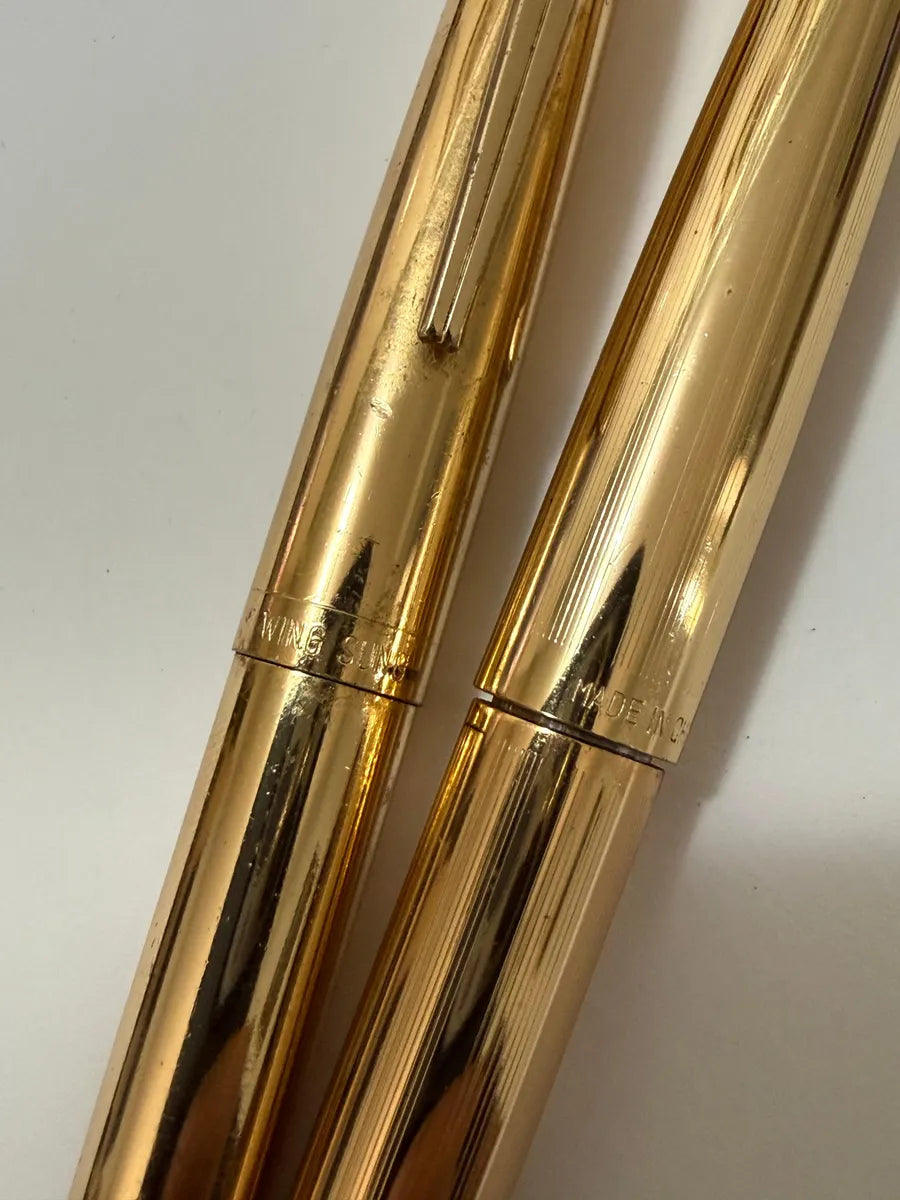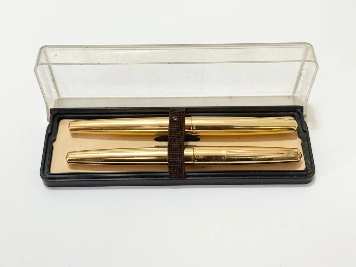 Conjunto vintage composto por caneta tinteiro e caneta esferográfica das marcas chinesas Hero e Wing Sung, em acabamento dourado, acompanhado de estojo.