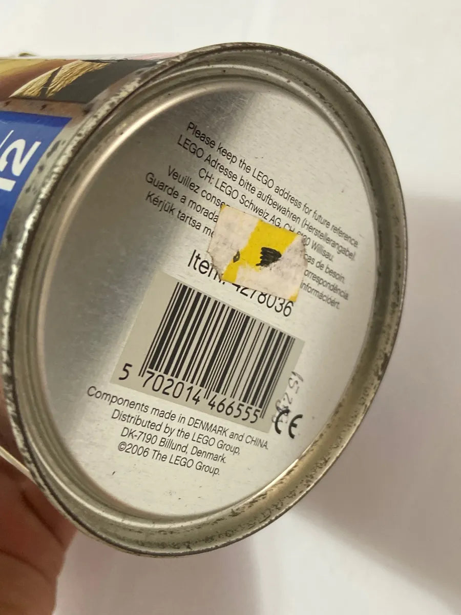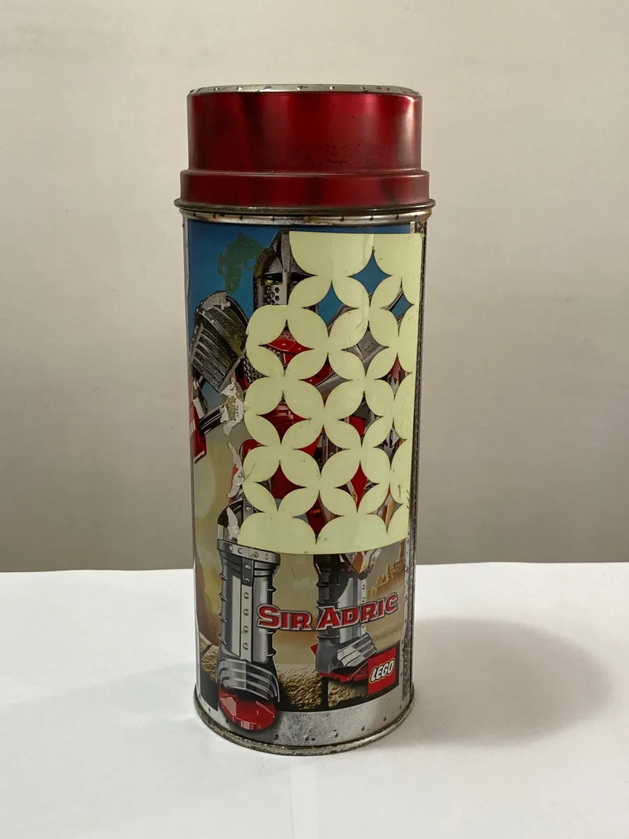 Lata metálica colecionável da linha LEGO Knights Kingdom, estampando o personagem Sir Adric. Produto original LEGO, com design temático medieval, ideal para fãs da marca ou colecionadores de artigos vintage. A lata está vazia e apresenta sinais de desgaste típicos do tempo, como pequenos riscos, ferrugem leve na tampa e marcas de uso — detalhes que adicionam autenticidade ao item.