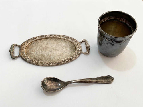 Lote Mini Colher Antiga Bandeja E Copo Antigo Cor Prata