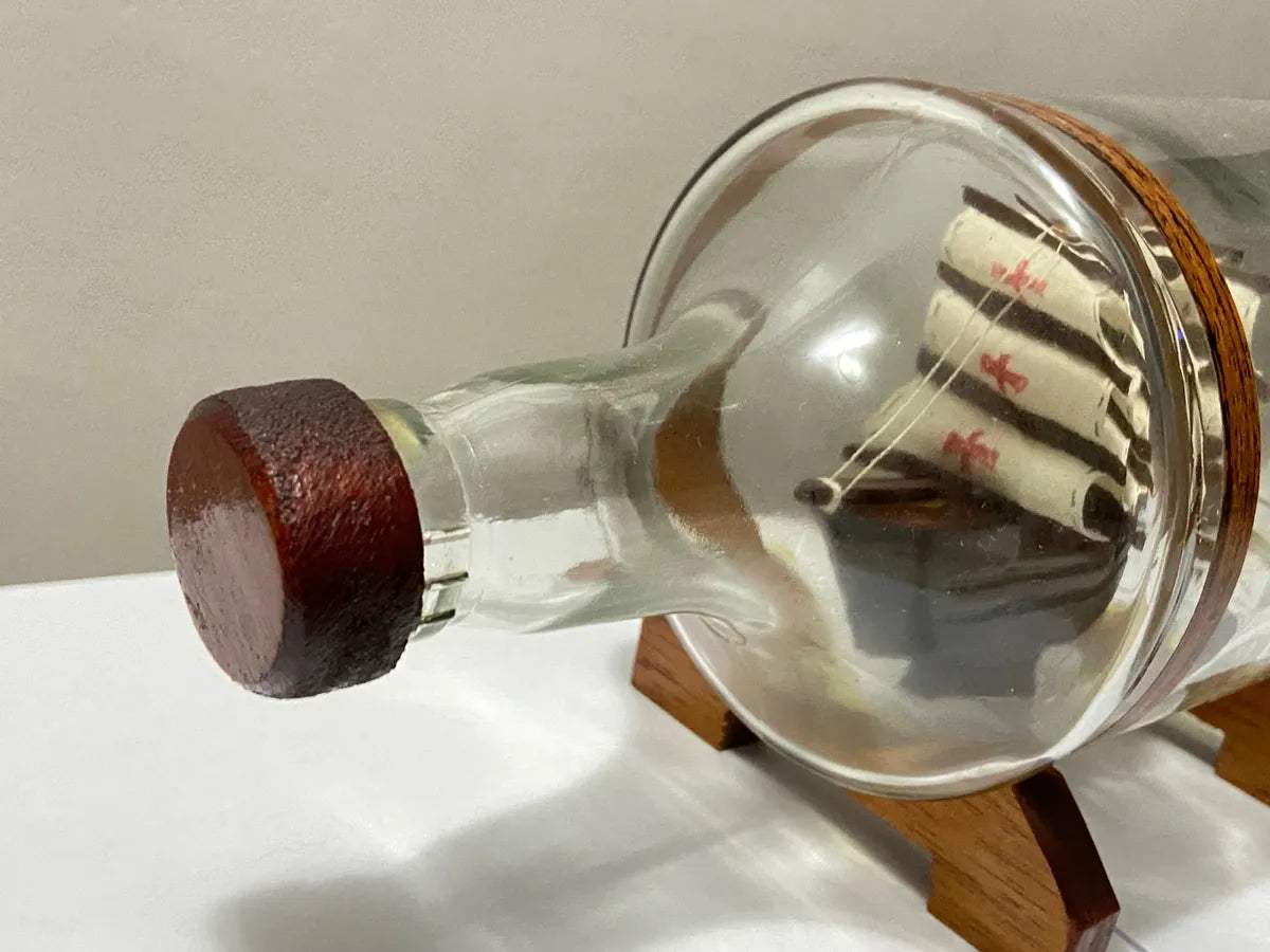 Miniatura Antigo Navio Em Garrafa De Vidro E Base De Madeira