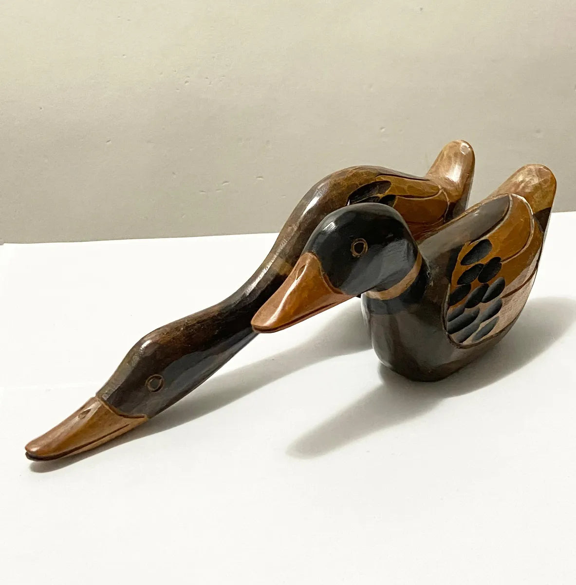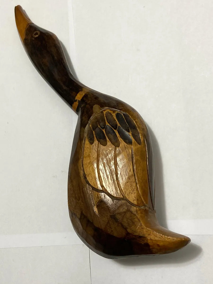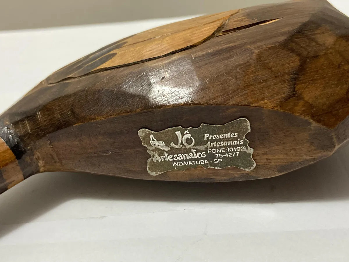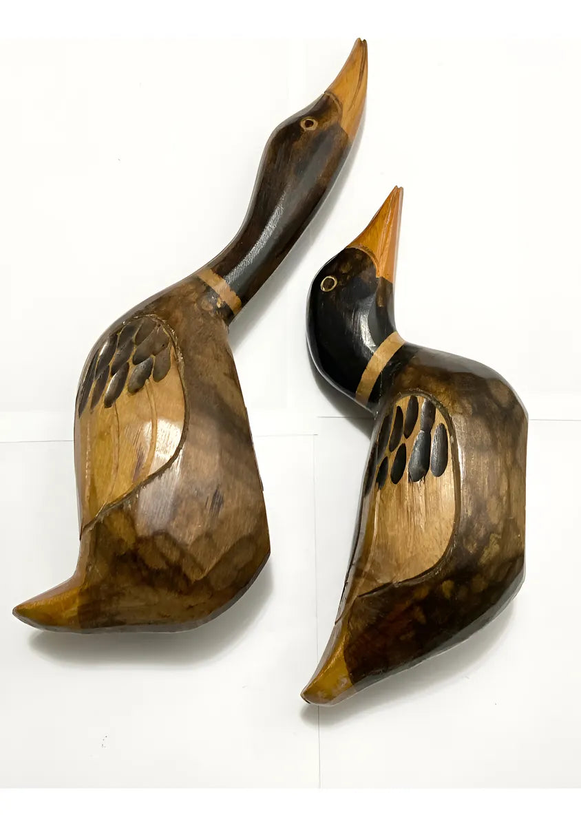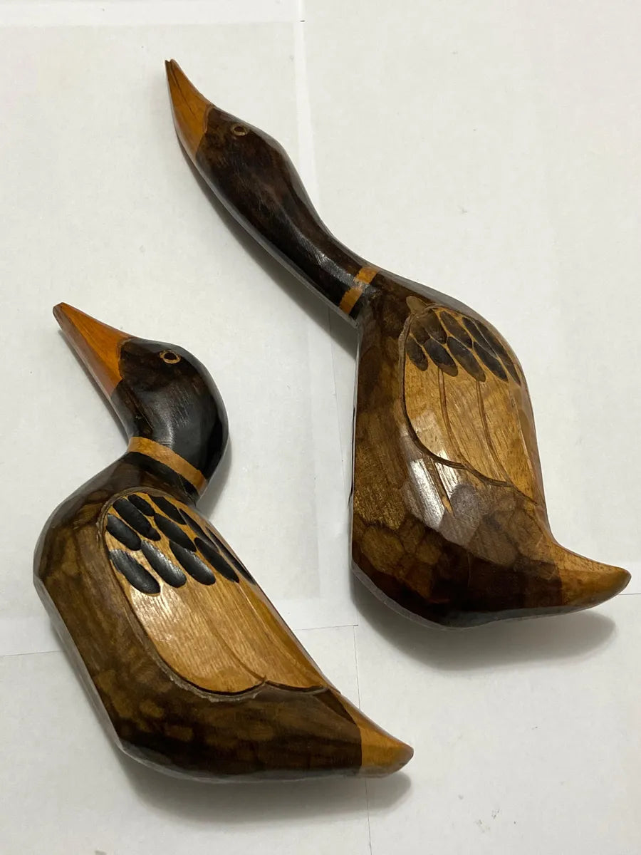 Belo conjunto com duas esculturas de patos entalhados à mão em madeira, com acabamento artesanal e pintura detalhada. As peças apresentam um trabalho artístico único, valorizando a textura natural da madeira e os traços do entalhe.