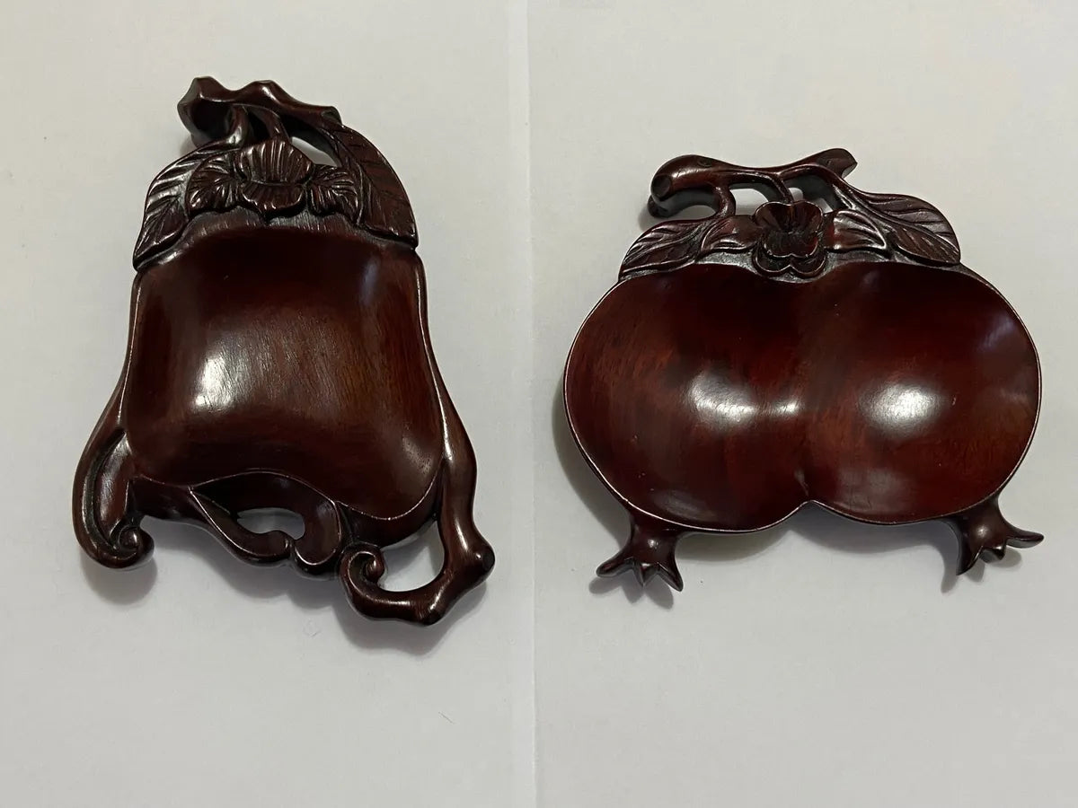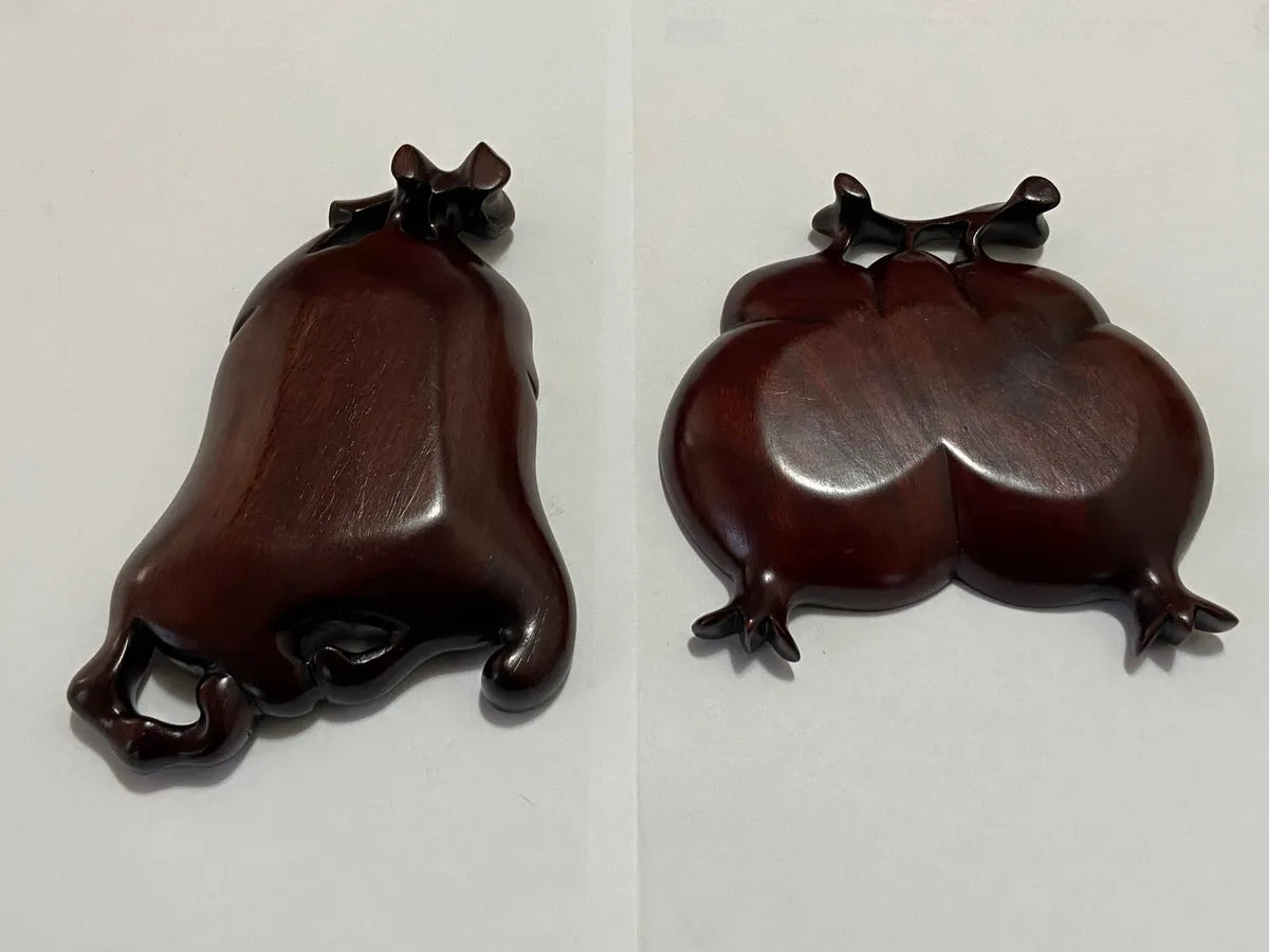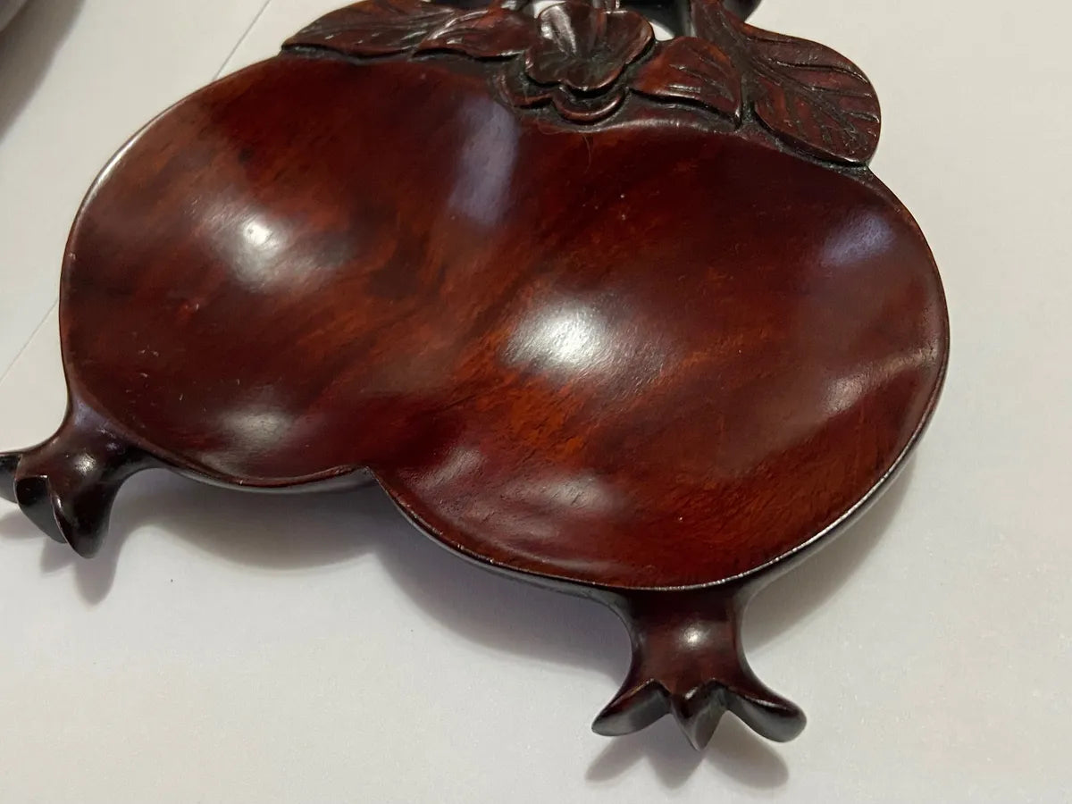 Belíssimo par de tigelas chinesas entalhadas à mão em madeira nobre, representando frutas tradicionais da cultura oriental, como o pêssego (símbolo de longevidade) e a romã (símbolo de fertilidade e prosperidade). As peças apresentam um acabamento polido e detalhes florais e folhagens entalhadas com maestria, evidenciando a habilidade artesanal e a estética refinada do objeto.