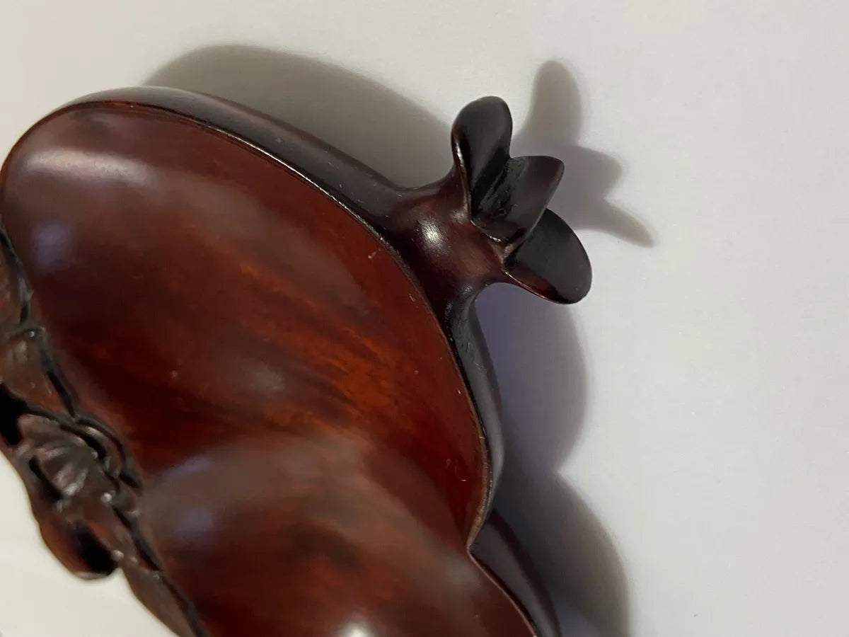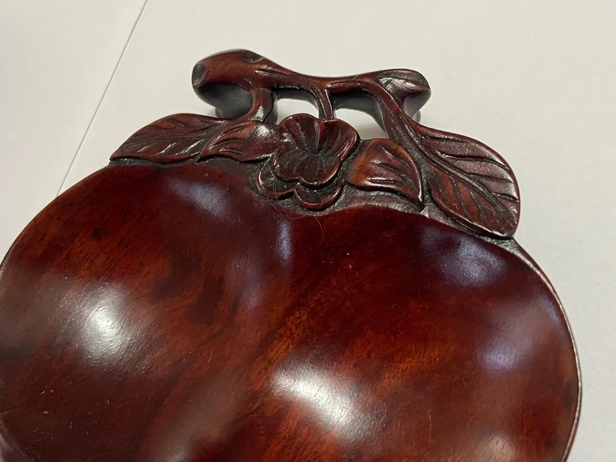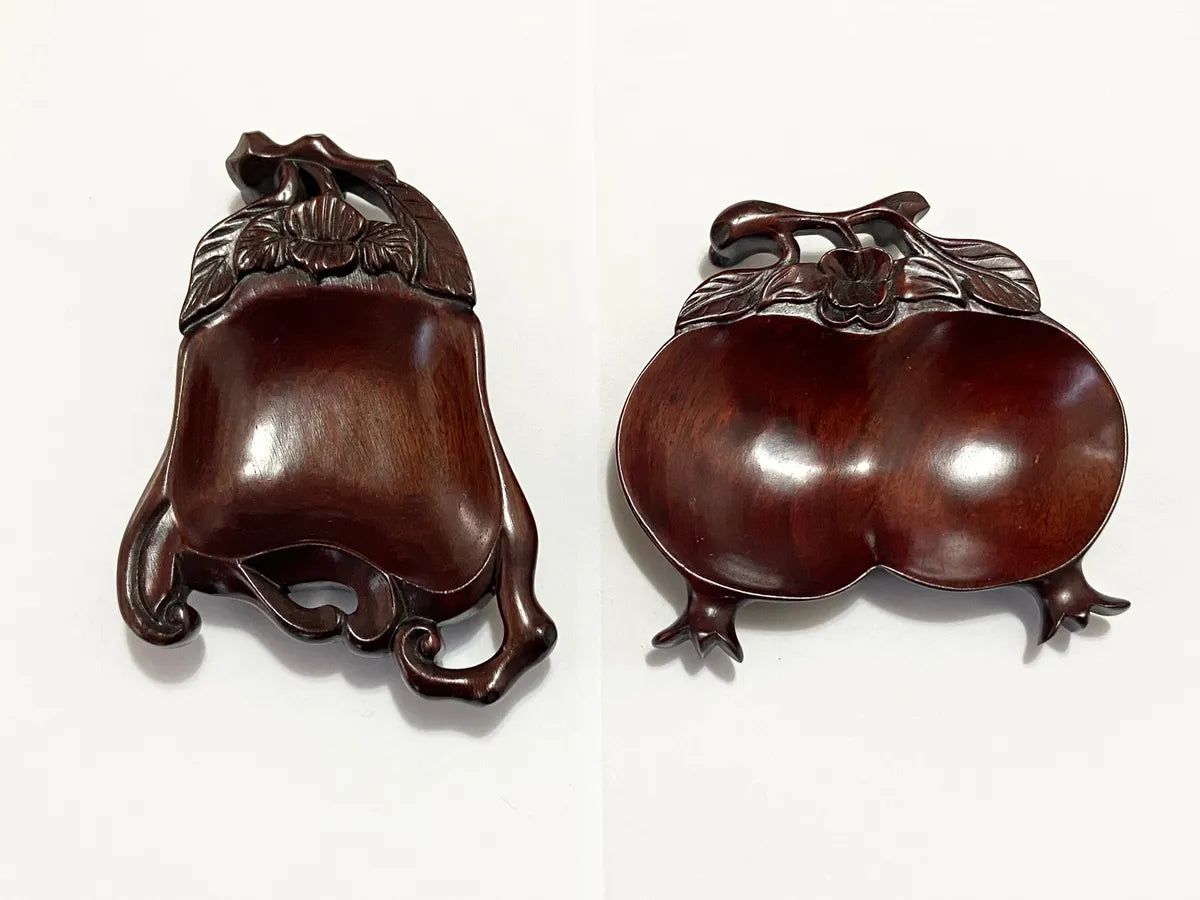 Belíssimo par de tigelas chinesas entalhadas à mão em madeira nobre, representando frutas tradicionais da cultura oriental, como o pêssego (símbolo de longevidade) e a romã (símbolo de fertilidade e prosperidade). As peças apresentam um acabamento polido e detalhes florais e folhagens entalhadas com maestria, evidenciando a habilidade artesanal e a estética refinada do objeto.