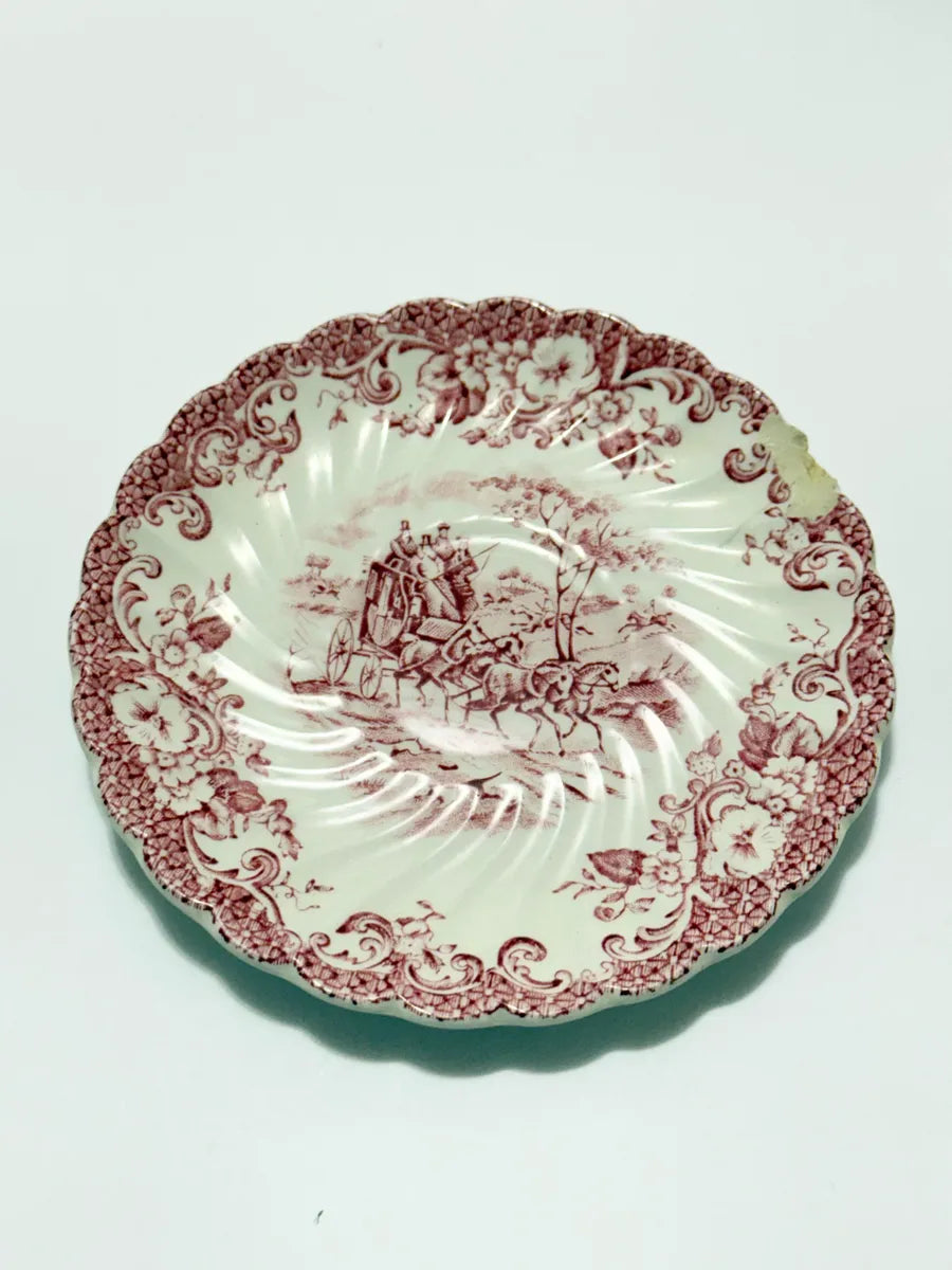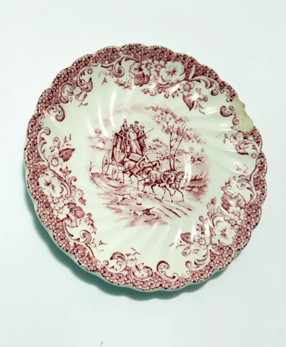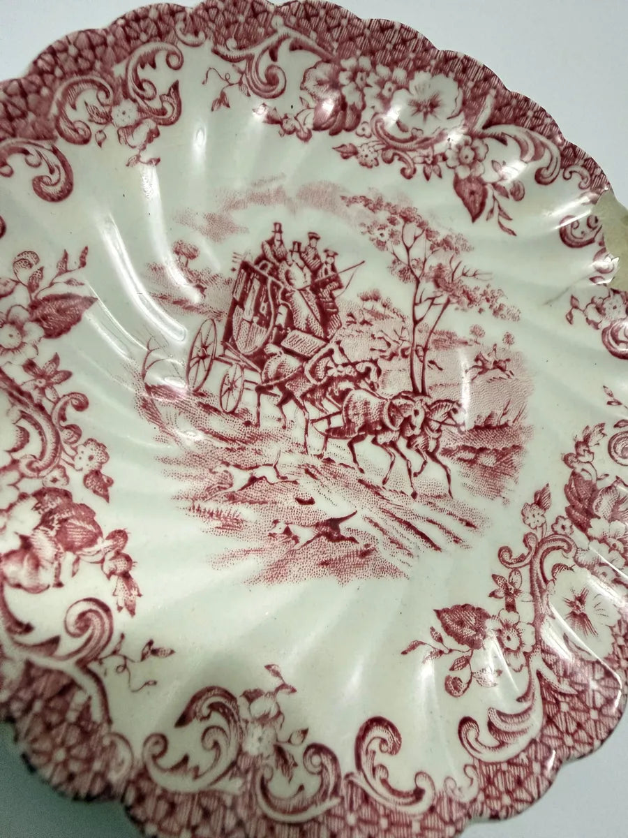 Prato decorativo antigo da renomada fabricante inglesa Johnson Bros, modelo “Coaching Scenes – Hunting Country”, produzido em ironstone (faiança inglesa). Apresenta ilustração em tom vinho retratando uma cena clássica de carruagem e cavalos, com bordas ornamentadas e em relevo.