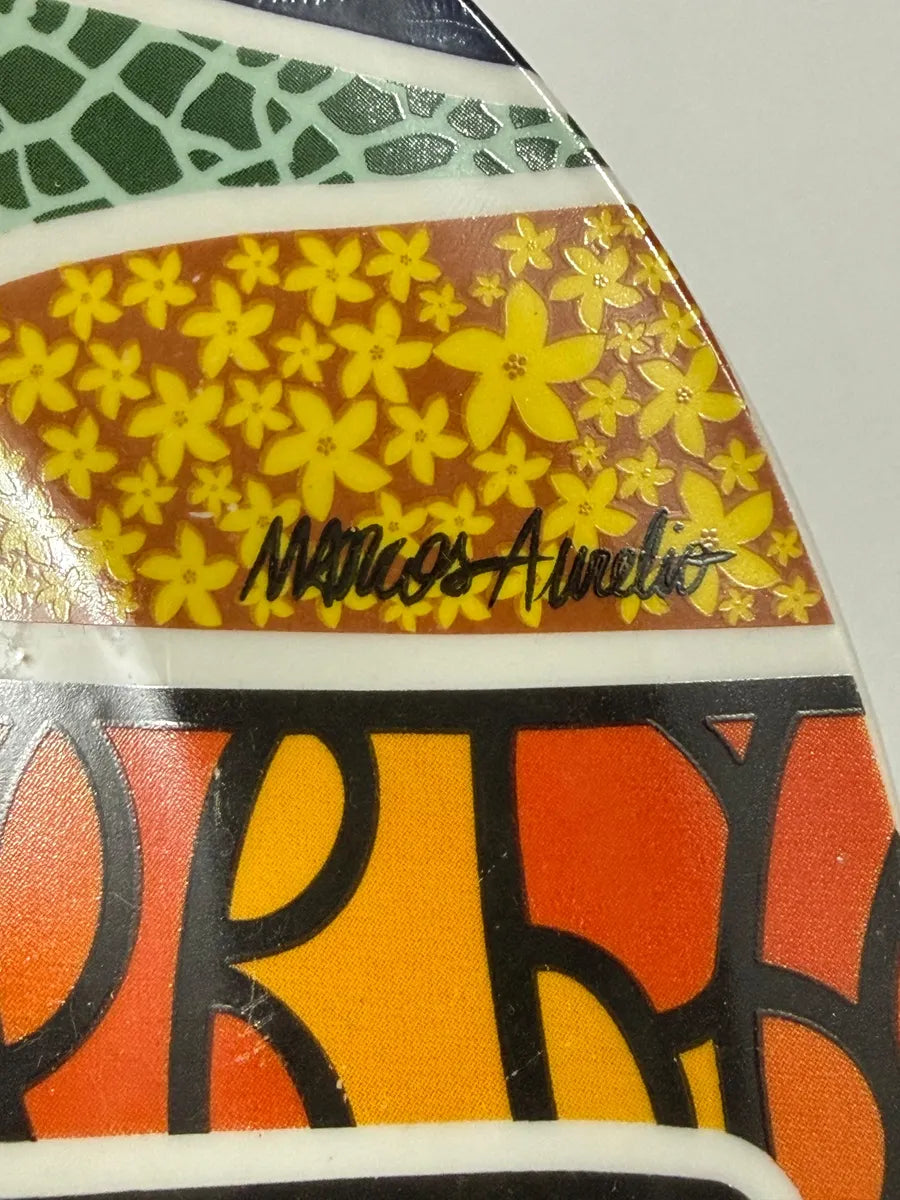 Prato decorativo da Coleção Pop Art Spoleto, edição limitada de 2012, assinado pelo artista Marcos Aurélio. A peça traz estampa vibrante com tucanos em estilo colorido e moderno, inspirado na pop art brasileira.
