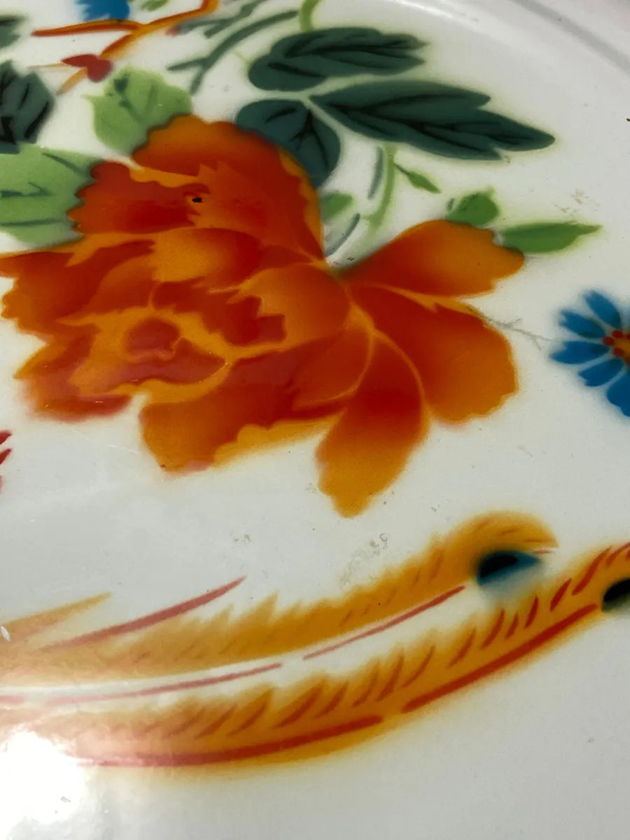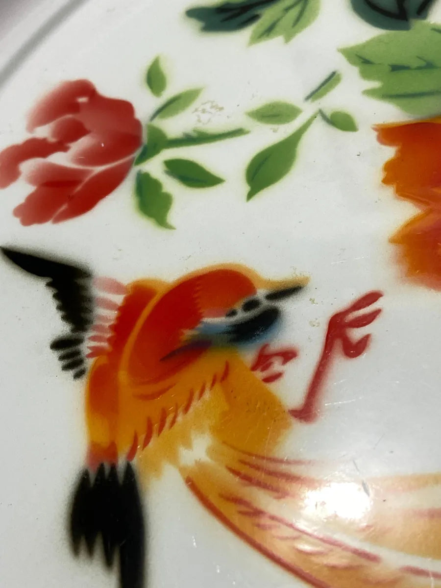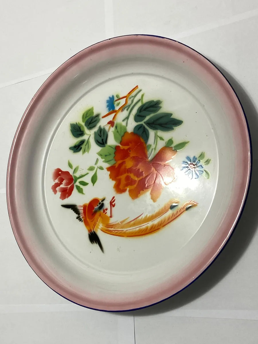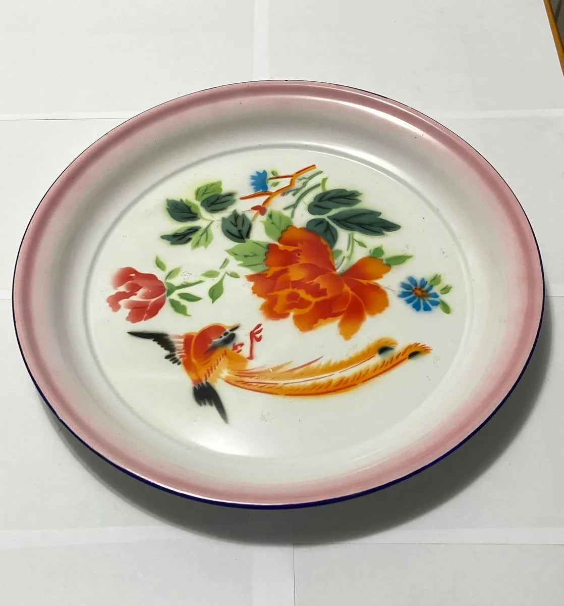 Prato esmaltado antigo da marca Bumper Harvest, fabricado na China. Possui 40 cm de diâmetro, com borda em tom rosado e estampa colorida de flores e pássaro, no estilo tradicional oriental. No verso apresenta a marca de fabricação original.