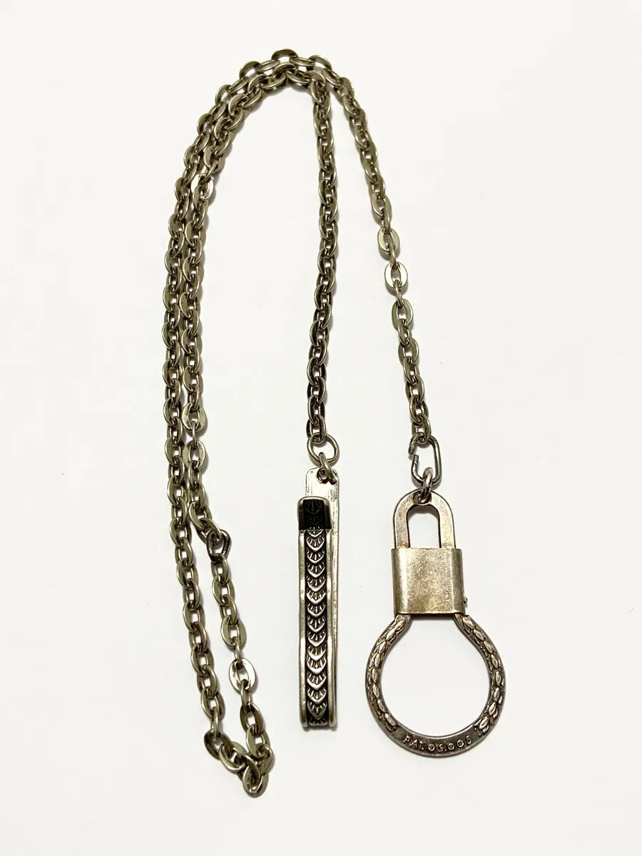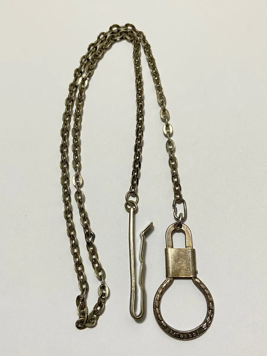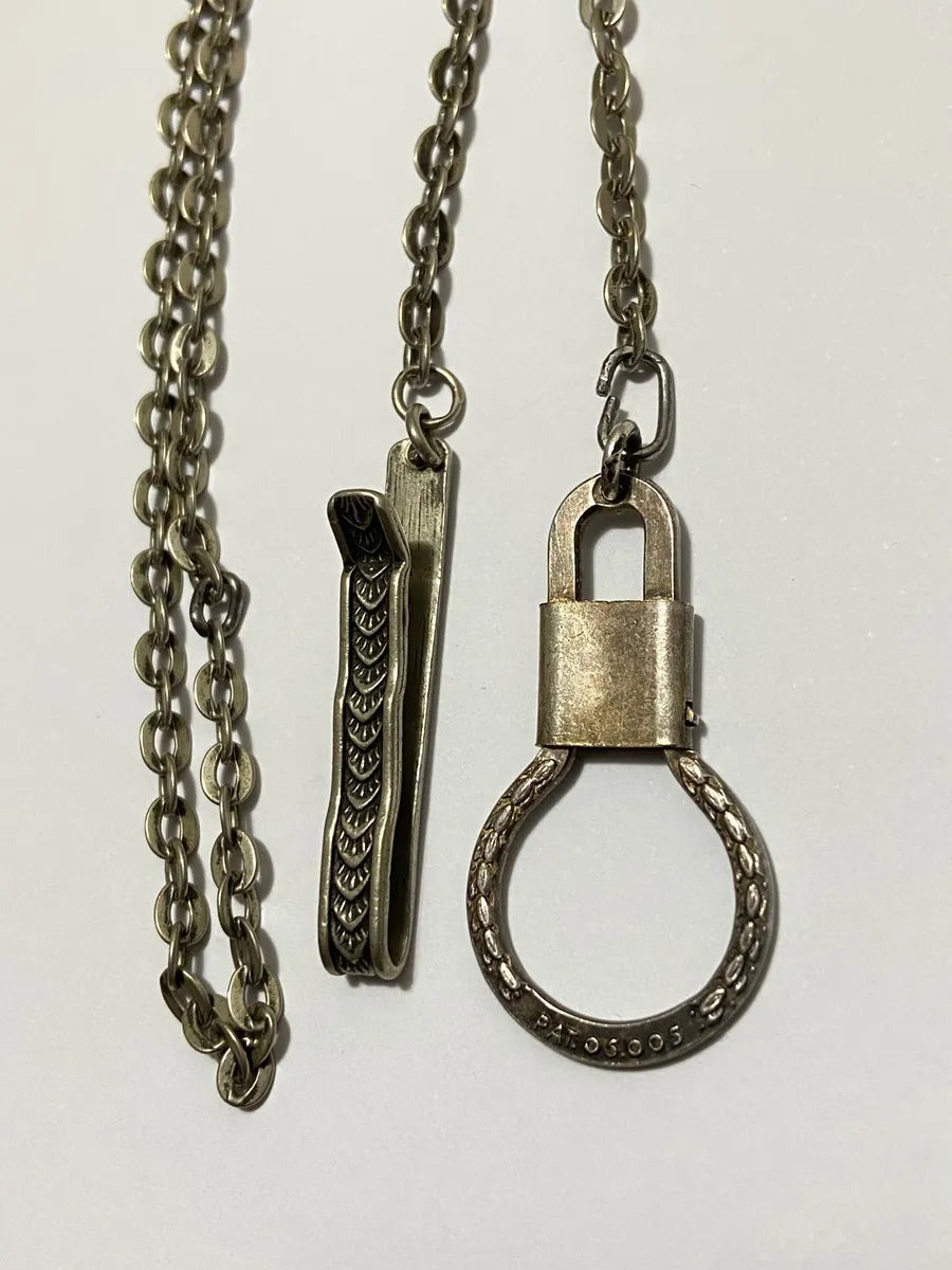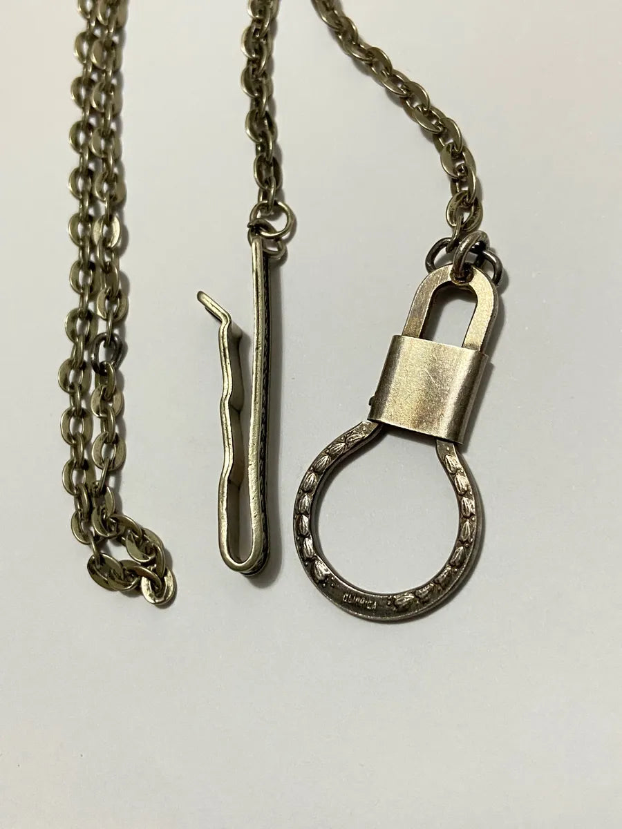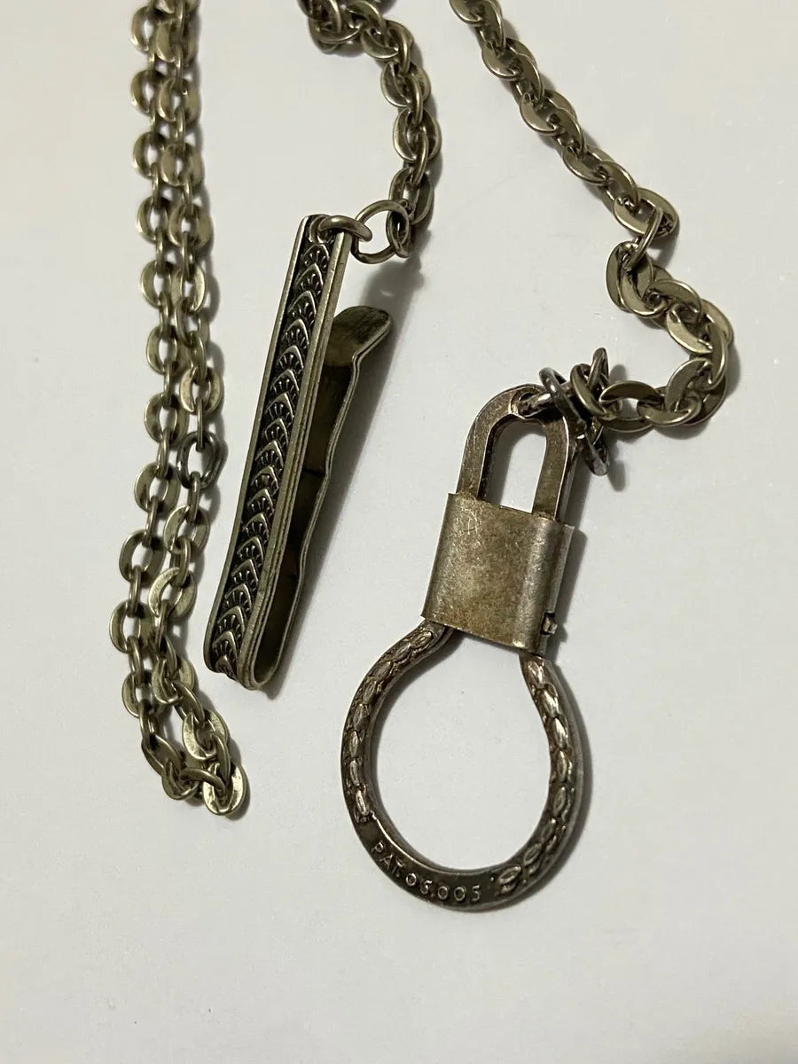 Prendedor de gravata vintage em metal com elegante padrão em relevo, acompanhado de uma corrente de segurança e fecho com aro circular.