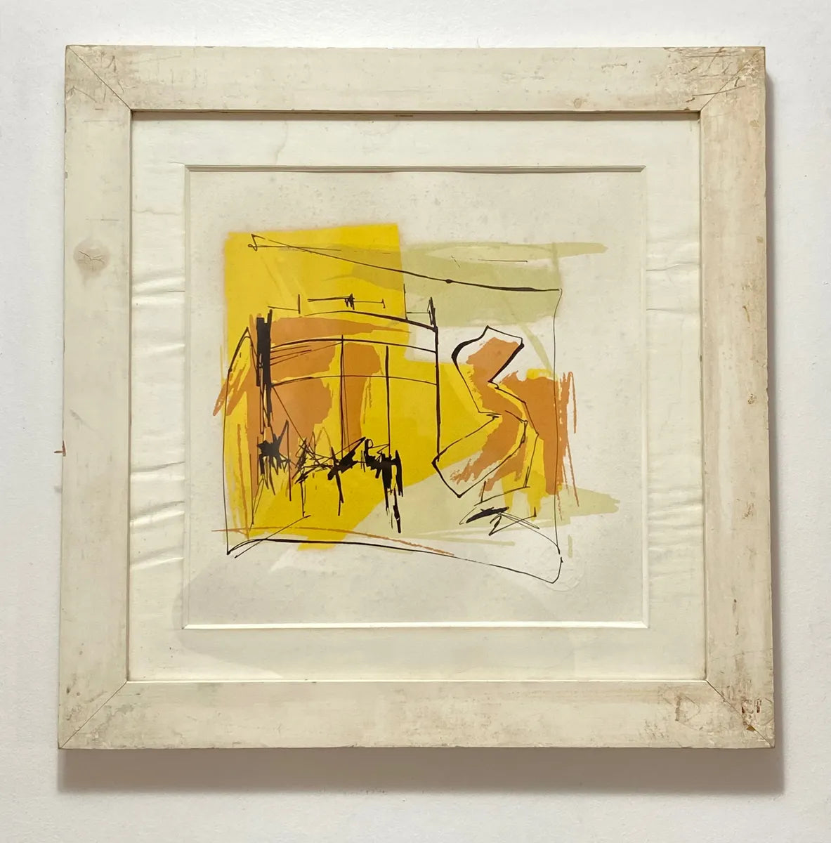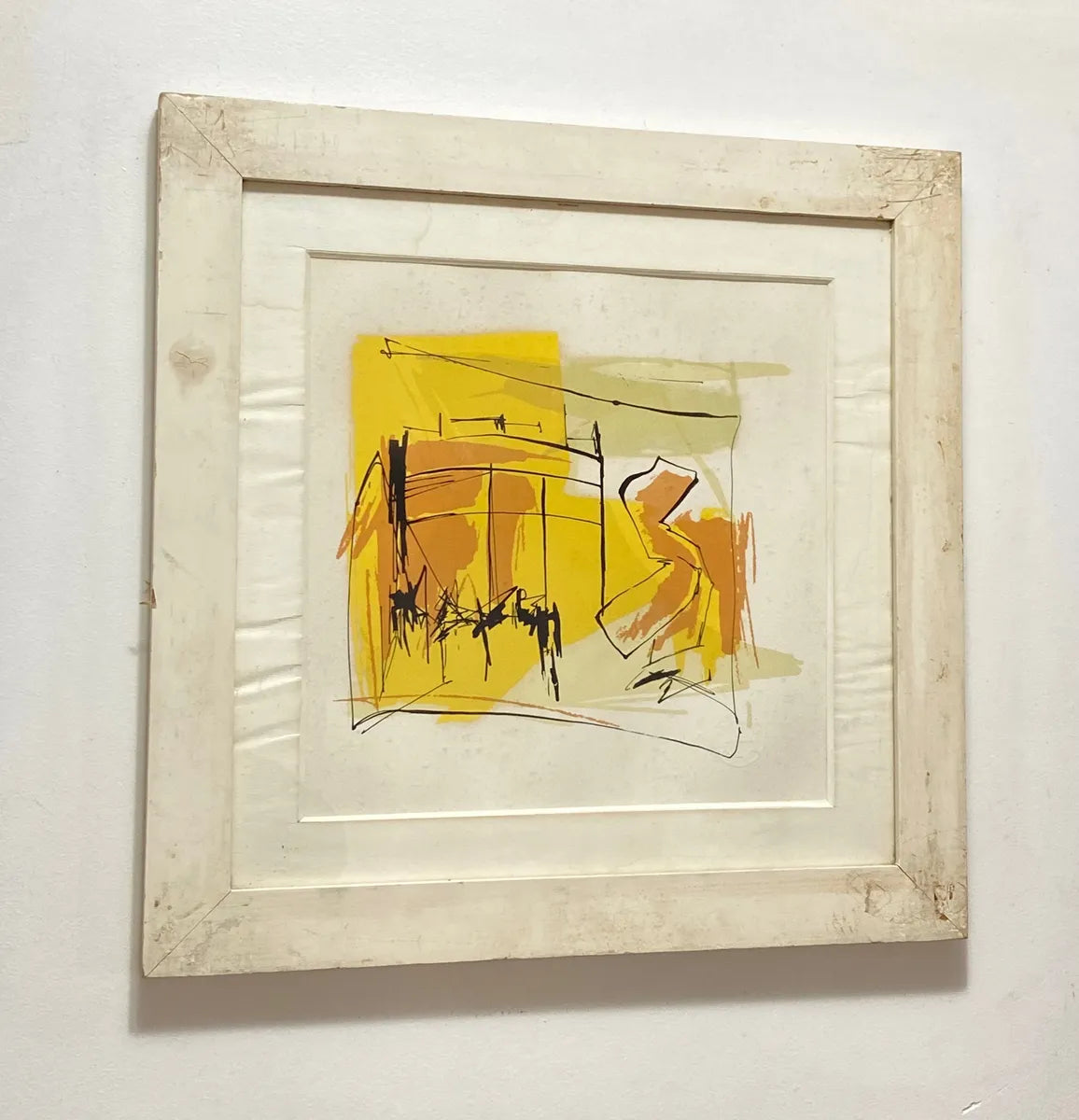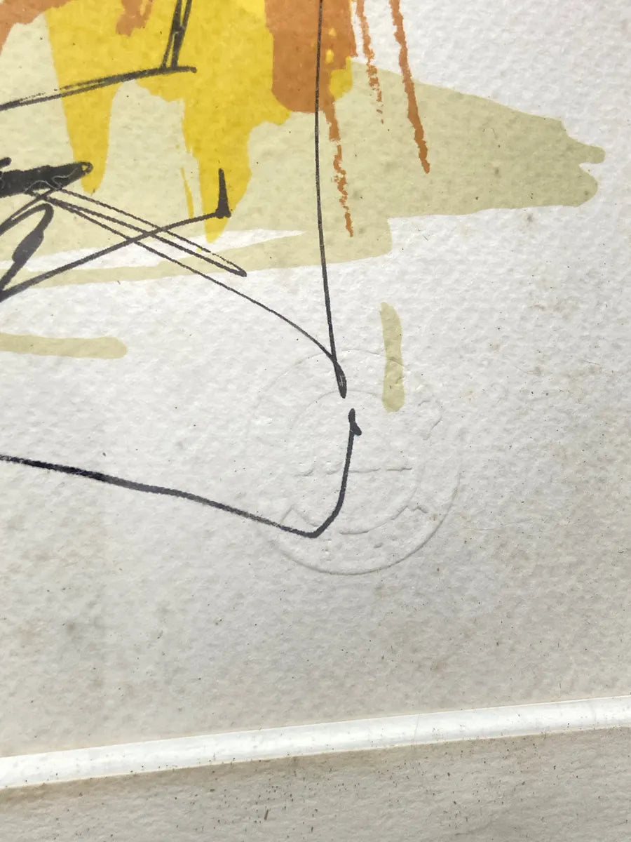 Obra de arte abstrata com composição moderna em tons vibrantes de amarelo, laranja e verde, com traços expressivos em preto. Com selo em relevo.