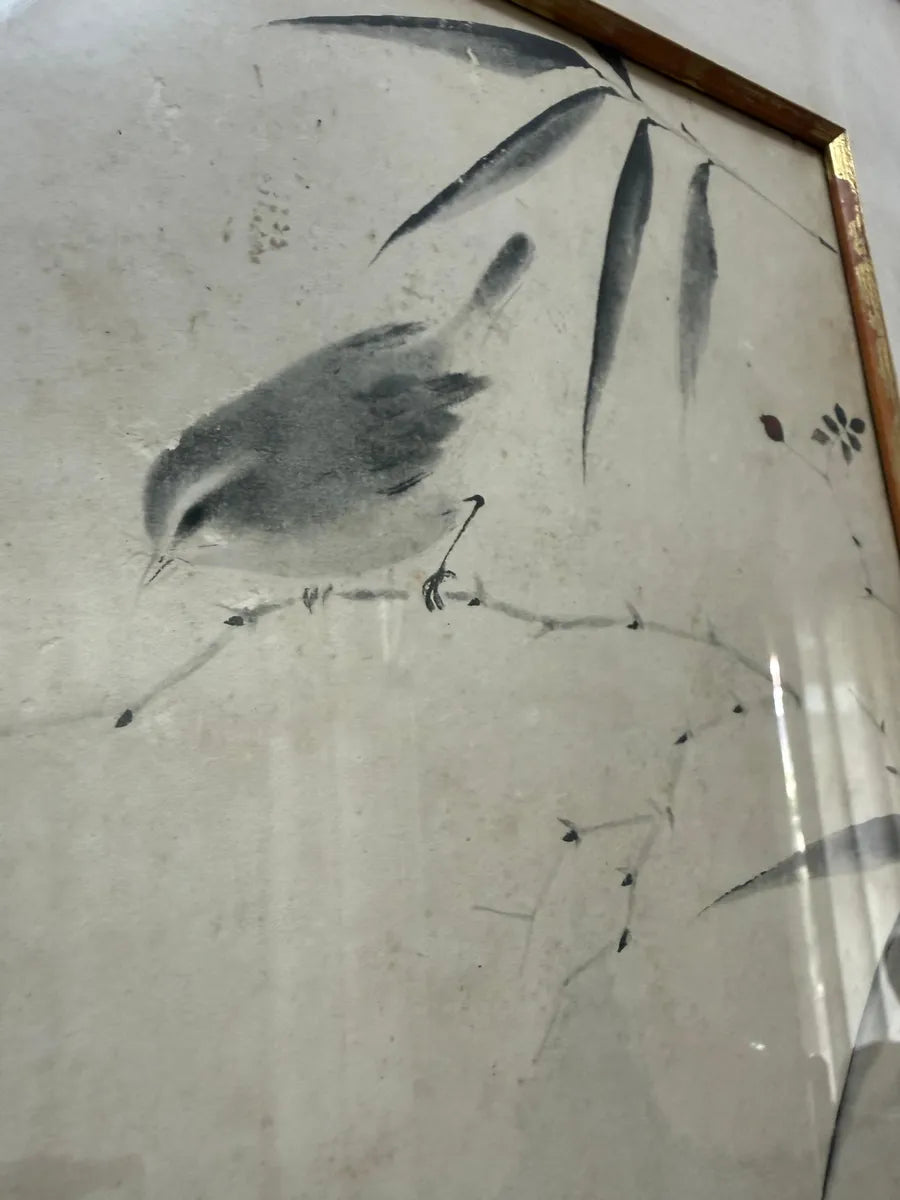 Quadro Antigo Pintura Oriental Em Nanquim - Pássaro E Bambu