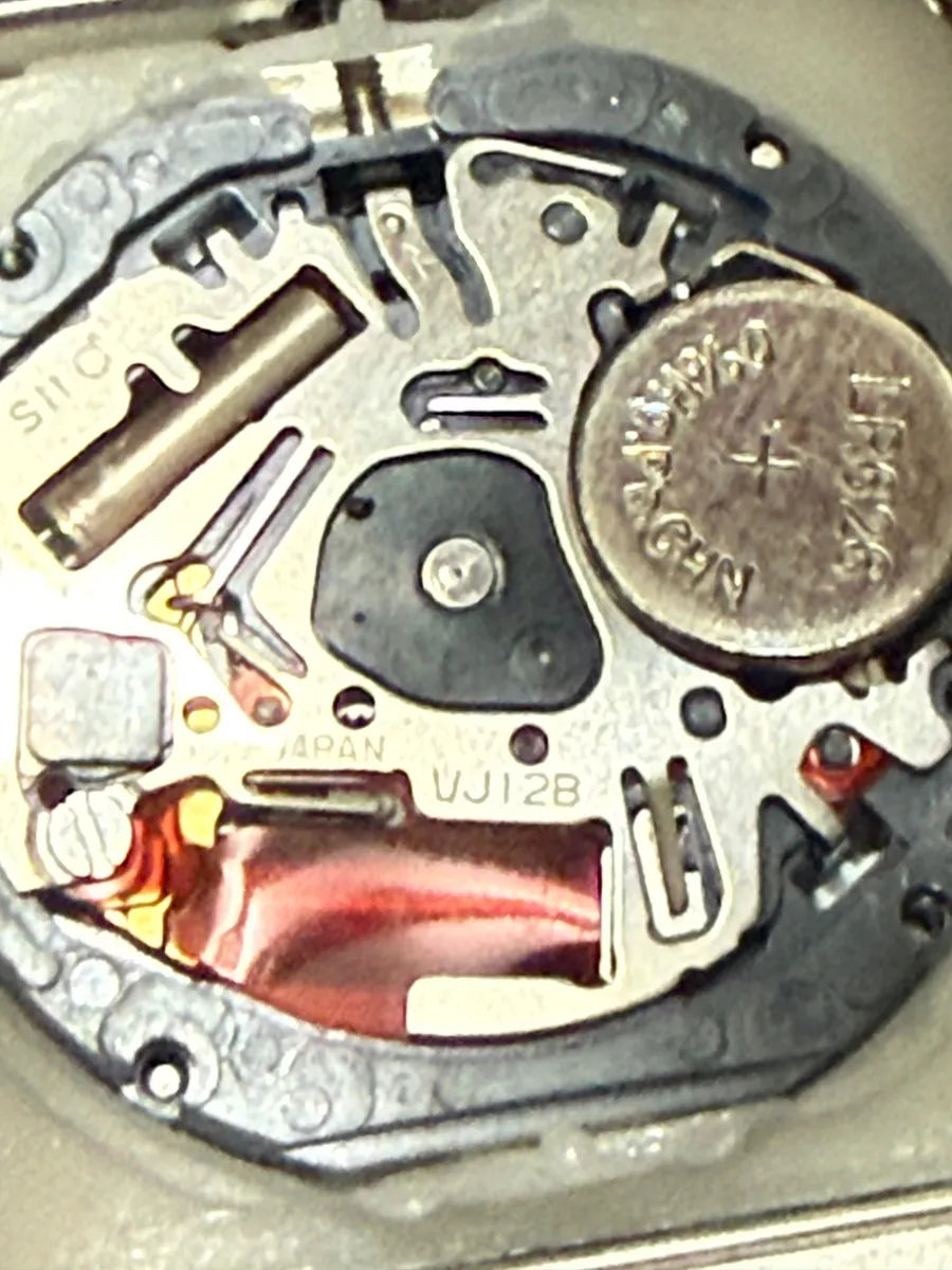 Movimento quartzo (Japan VJ12B) — funcionando normalmente.