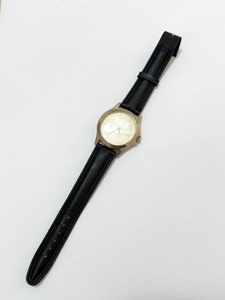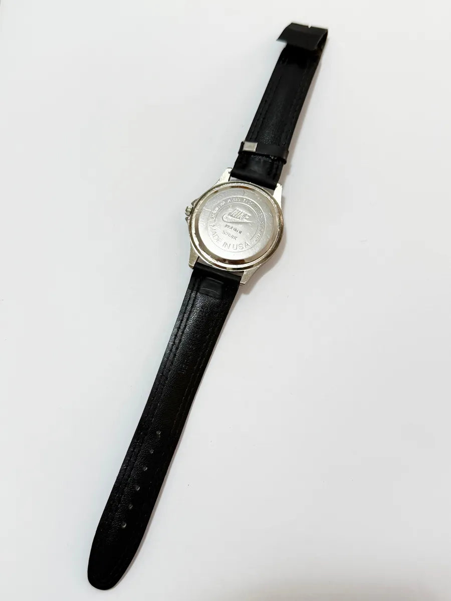 Relógio de pulso antigo com logotipo NIKE e inscrição "Just Do It" na tampa traseira. Peça de colecionador rara, possivelmente fabricada nos anos 90, com estilo esportivo clássico e mostrador simples.