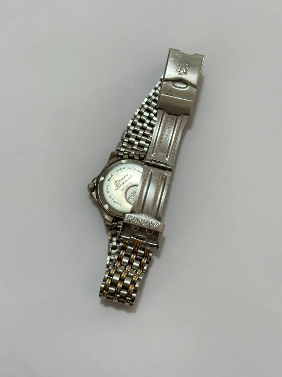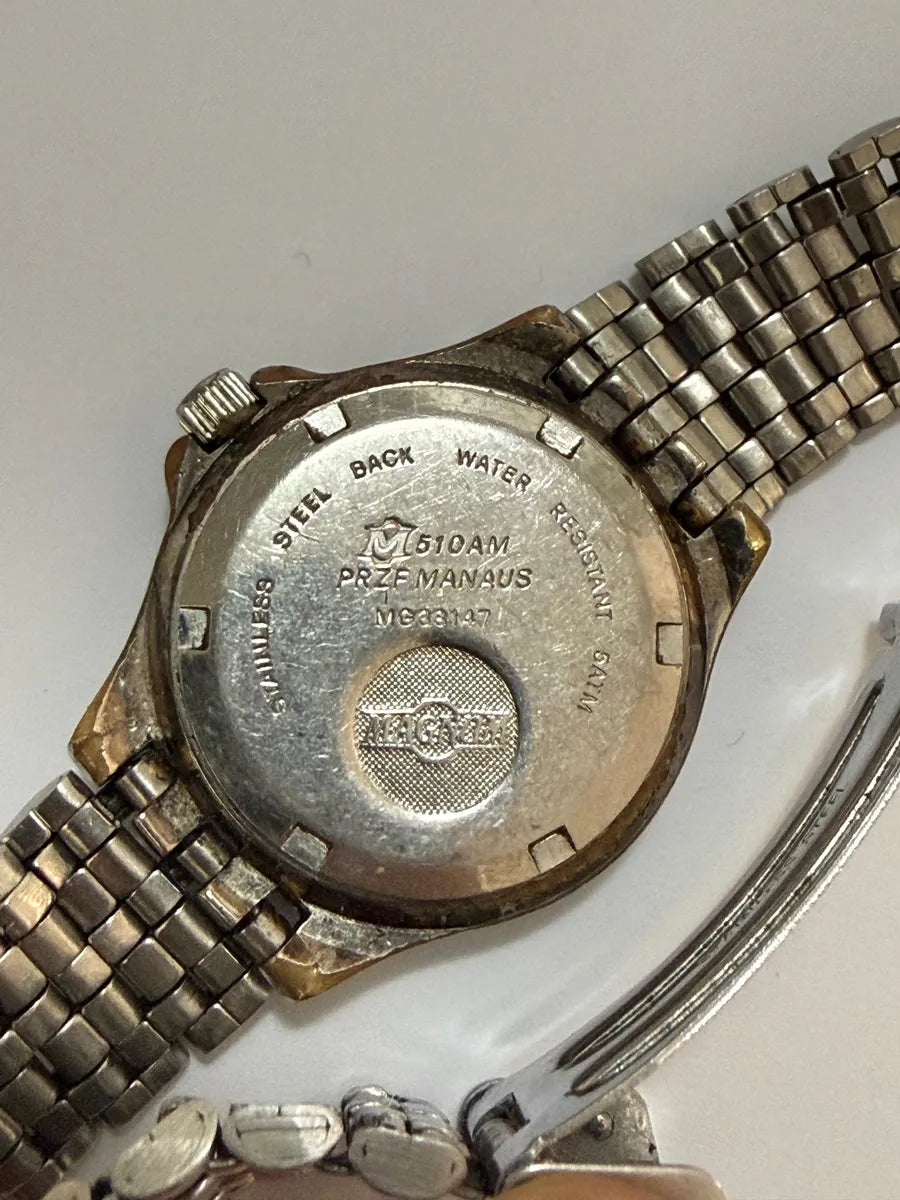 Relógio Magnum Quartz antigo, modelo M610AM, com pulseira de aço inox bicolor (dourado e prateado). Mostrador branco com marcadores dourados e aro giratório. Peça vintage, ideal para colecionadores ou restauração. Fabricado pela PRZF Manaus, resistente à água (Water Resistant).
