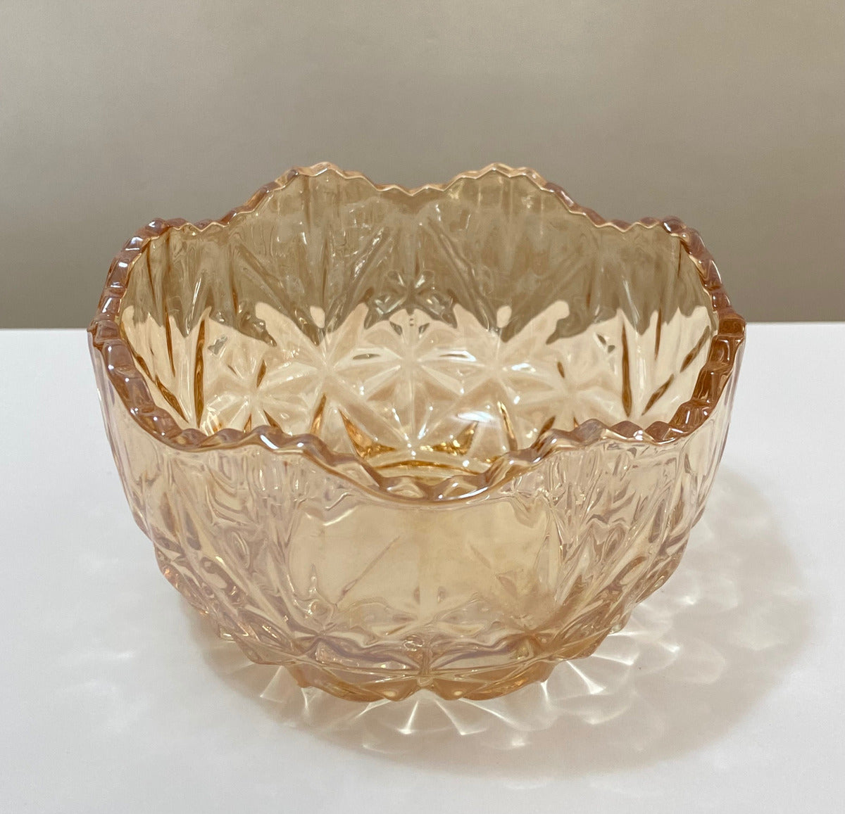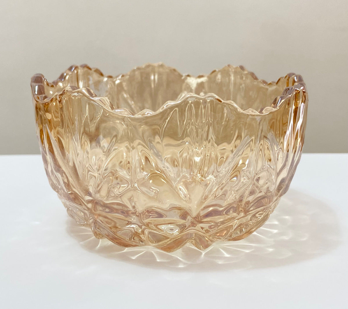 O destaque fica por conta dos relevos geométricos em toda a parte externa, que conferem textura, brilho e um toque artístico ao objeto. A borda ondulada reforça o estilo retrô e delicado da peça, tornando-a perfeita para composições em mesas postas, aparadores ou vitrines decorativas.
